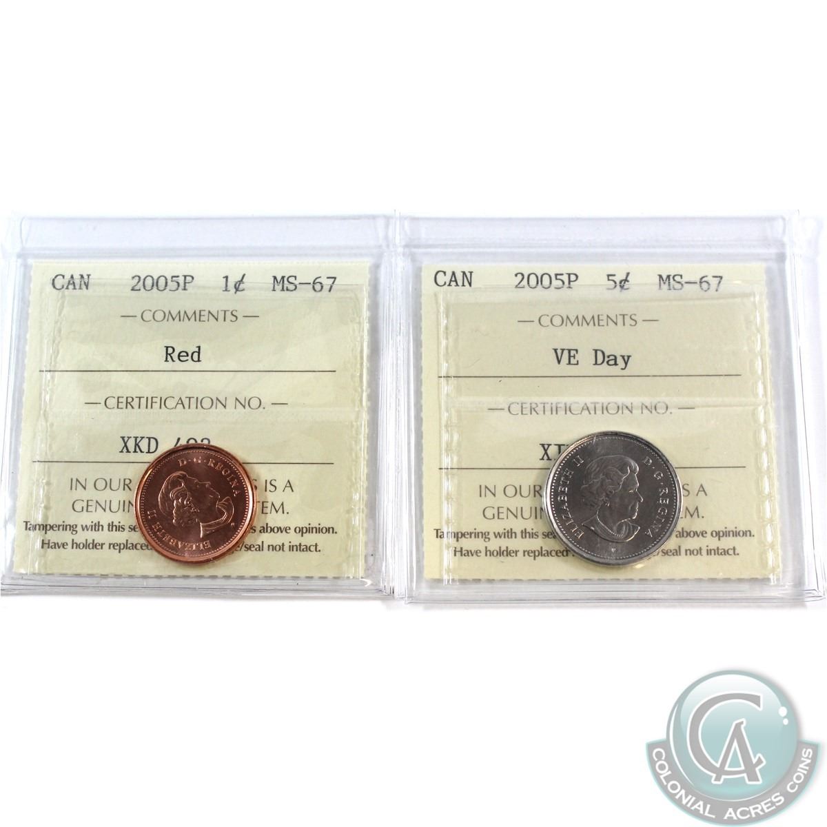 1-cent 2005P & 5-cent 2005P VE Day ICCS Certified MS-67. 2pcs