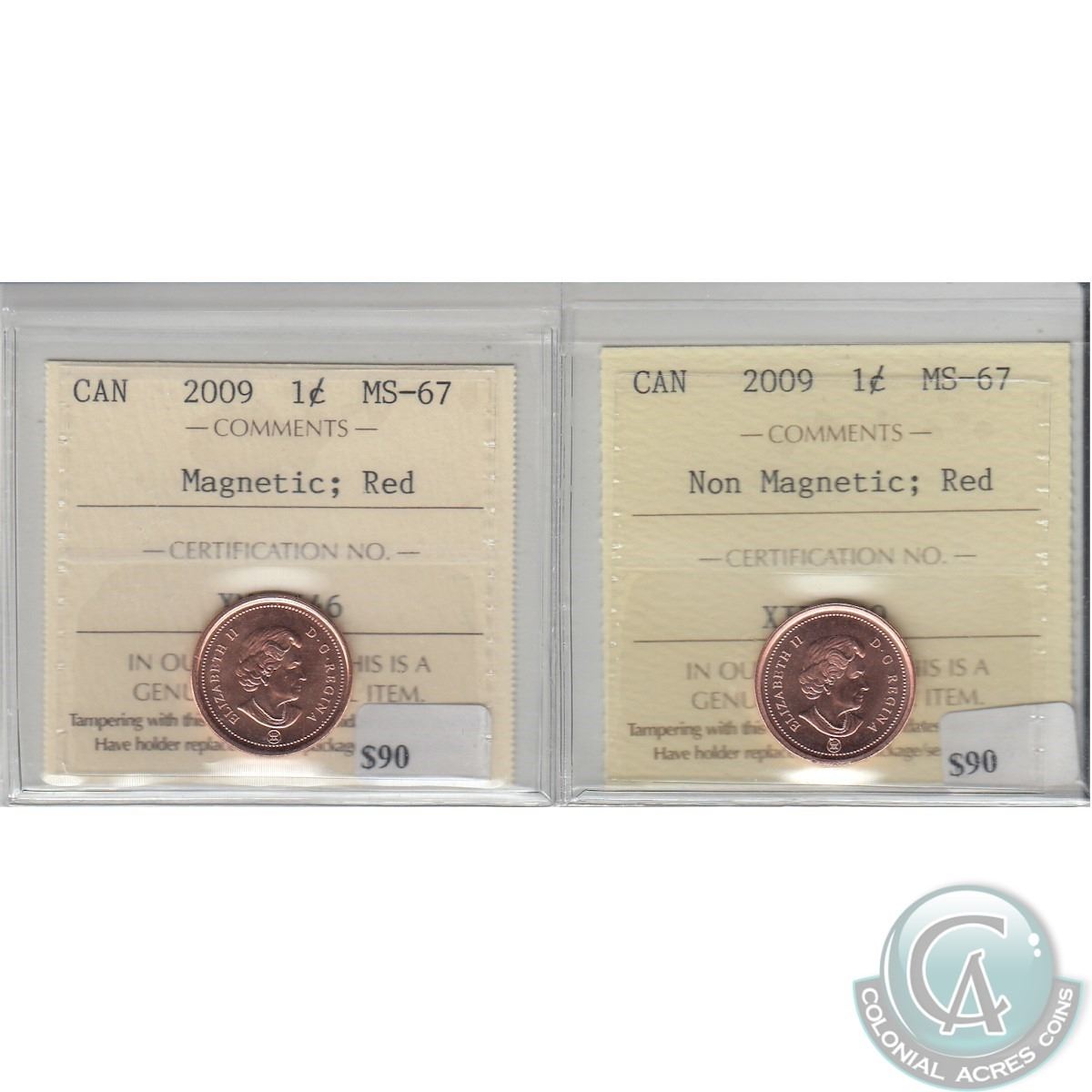 1-cent 2009 Magnetic & Non-Magnetic ICCS Certified MS-67 Red. 2pcs.