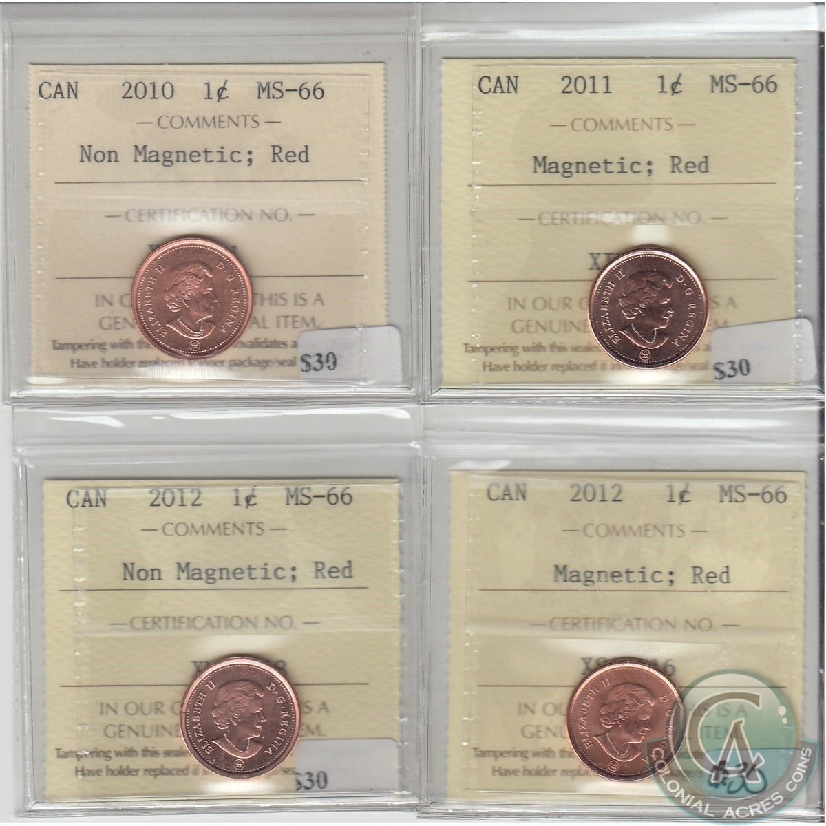 1-cent 2010 Non-Magnetic, 2011 Magnetic, 2012 Non-Magnetic & 2012 Magnetic ICCS Certified MS-66 Red. 4pcs.