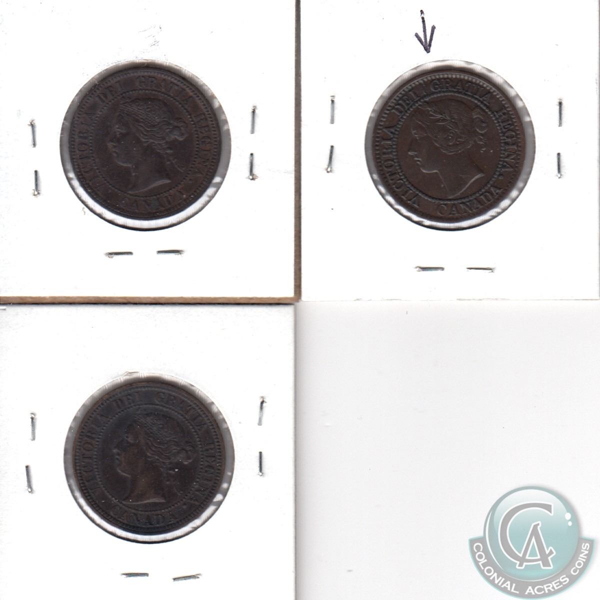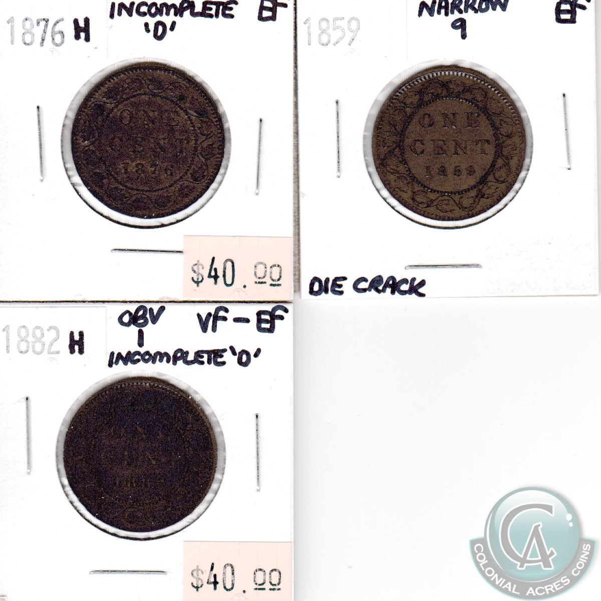 1-cent Errors 1859 Narrow 9 Die Crack on Obverse after "DEI" in EF, 1876H Incomplete 'D' in 'CANADA" EF & 1882H Obverse 1 Incomplete 'D' VF-EF. 3pcs