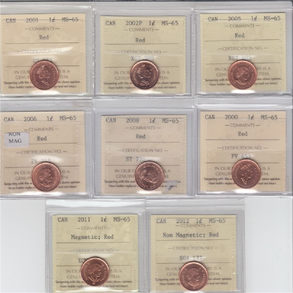 1-cent group lot of ICCS MS65 Red; 2000, 2001, 2002P, 2005, 2006 non magnetic, 2008 magnetic, 2011 magnetic & 2012 non magnetic. 8pcs