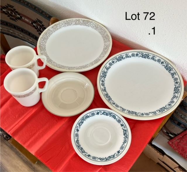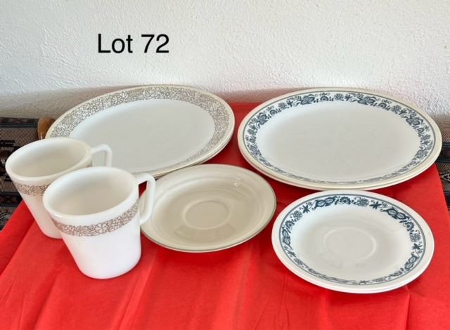 1 corningware mugs, 3 matching large plates, 3 corelle saucers with 2 matching plates