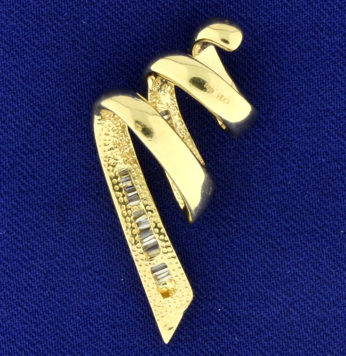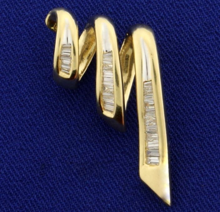 In 14k yellow gold. Contains twenty six  high quality baguette shaped diamonds, VS clarity/G color. 1 1/4" long and 1" wide. 7.3g.