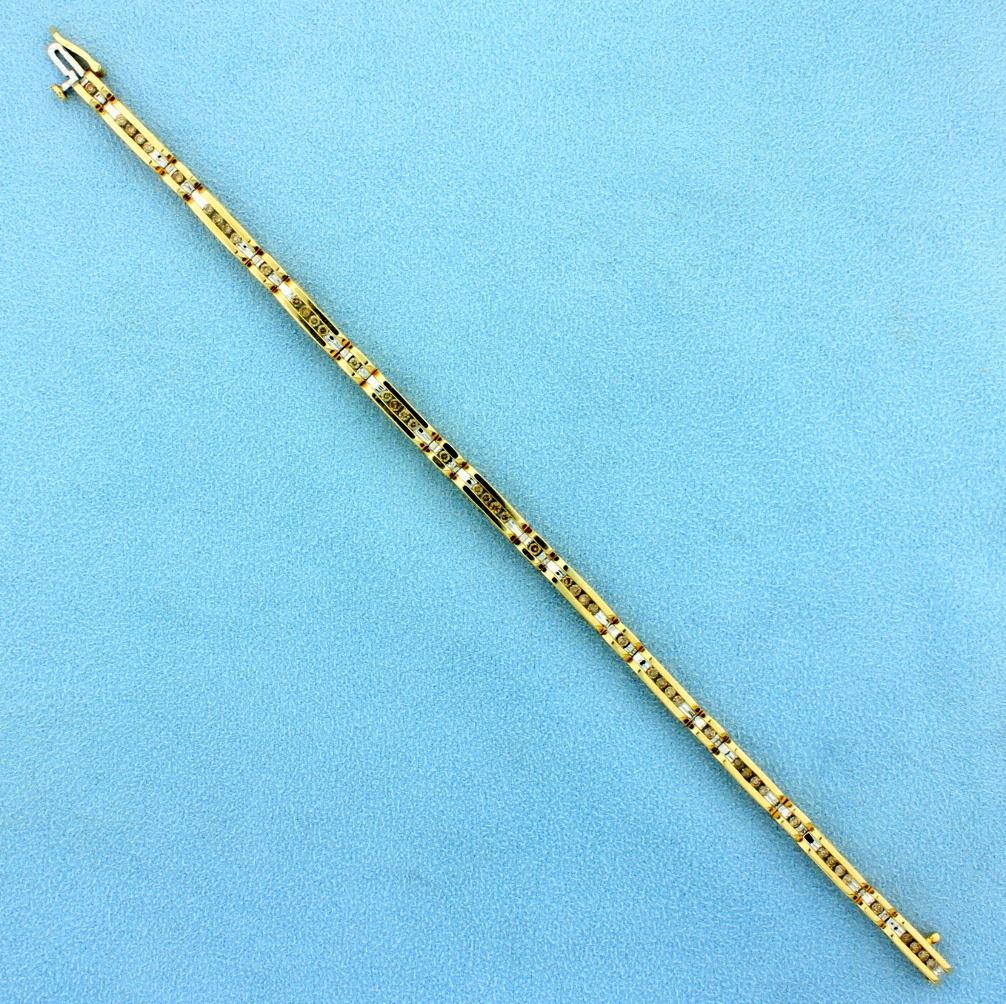 In 14K yellow & white gold, it contains fifty .02ct round chocolate diamonds with beautiful warm color. The bracelet is 7 1/2 inches long and has a safety clasp.          13.3g