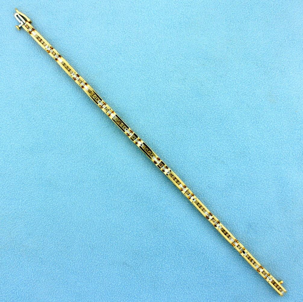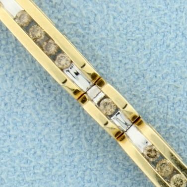 In 14K yellow & white gold, it contains fifty .02ct round chocolate diamonds with beautiful warm color. The bracelet is 7 1/2 inches long and has a safety clasp. 13.3g