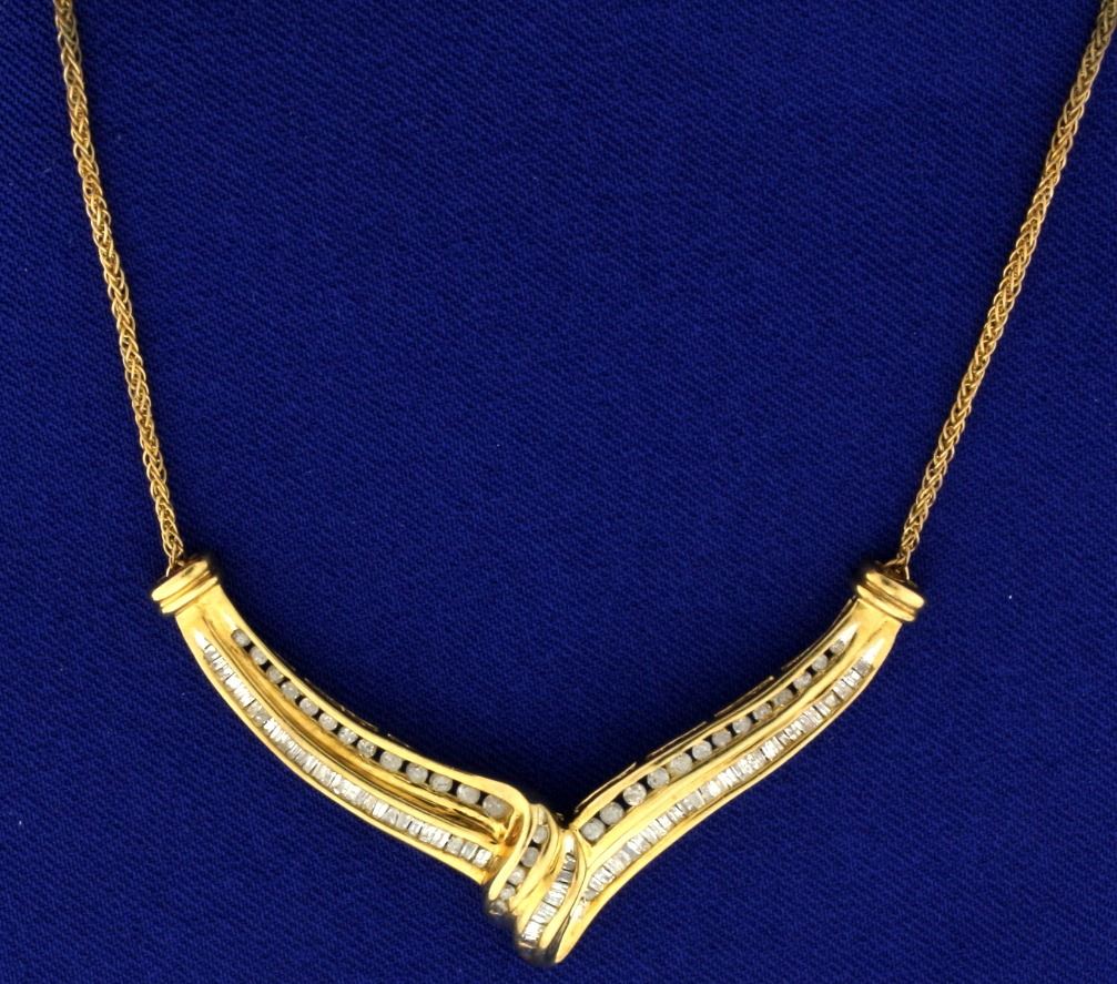 Elegant diamond freeform custom made 10k yellow gold necklace with 1 carat of diamonds! The diamonds are I clarity/I color. The necklace is a great length at 20" long with attached chain. This is a great piece to wear for work or play with its big look. 7.1g