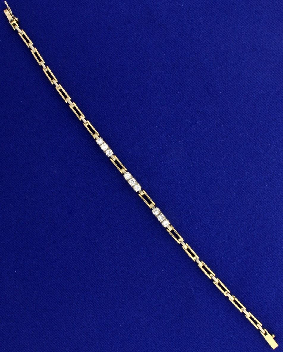 In 14k yellow and white gold. 7 1/2 Inches long, with safety clasp. Contains nine high quality diamonds, VS clarity/H color. 11.2g.