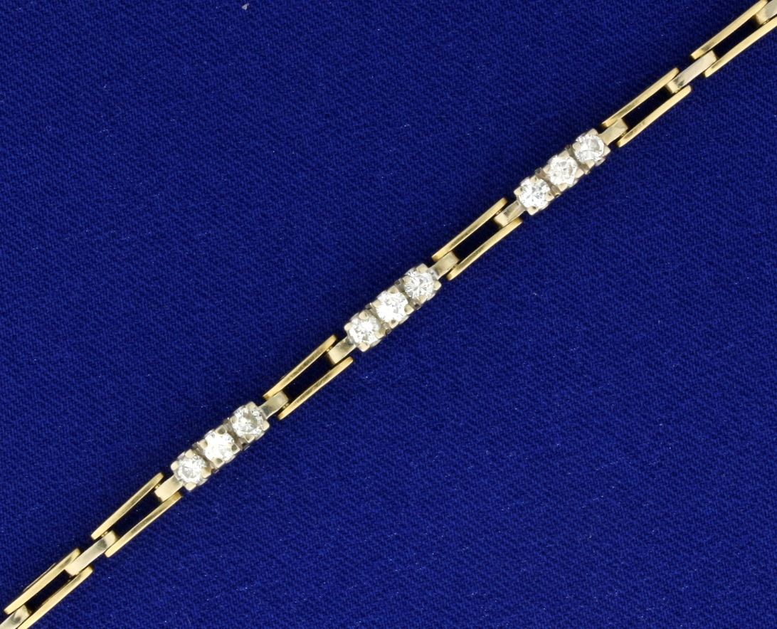 In 14k yellow and white gold. 7 1/2 Inches long, with safety clasp. Contains nine high quality diamonds, VS clarity/H color. 11.2g.