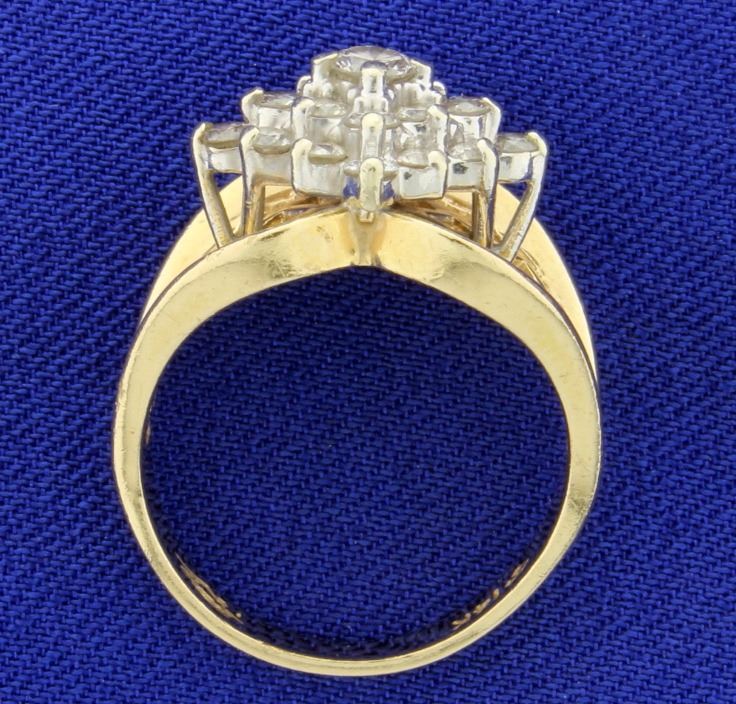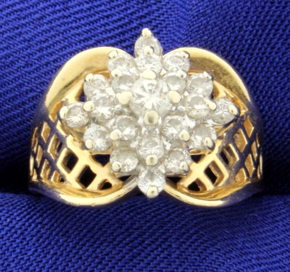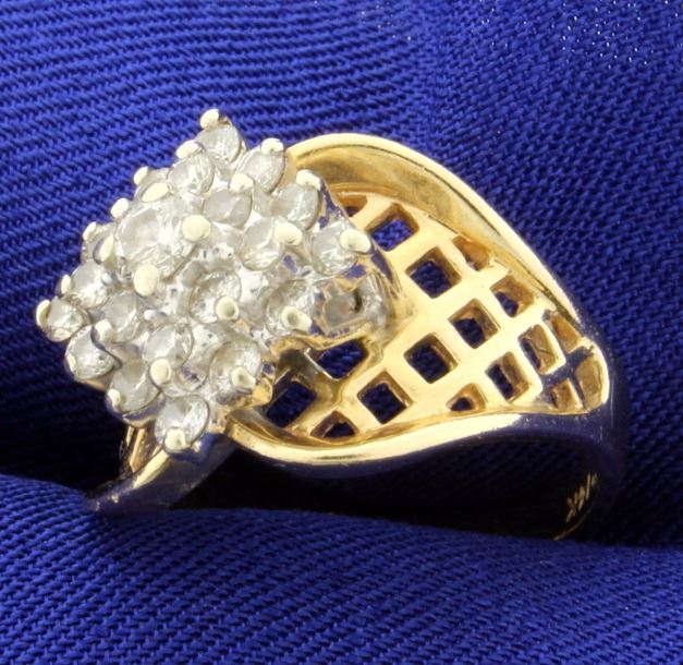In 14K yellow gold, there are twenty one .04ct and one .15ct diamonds, all high quality diamonds of SI clarity, I color. Size 7 1/4 6.4g