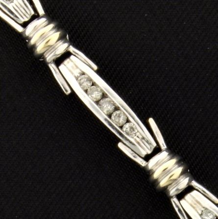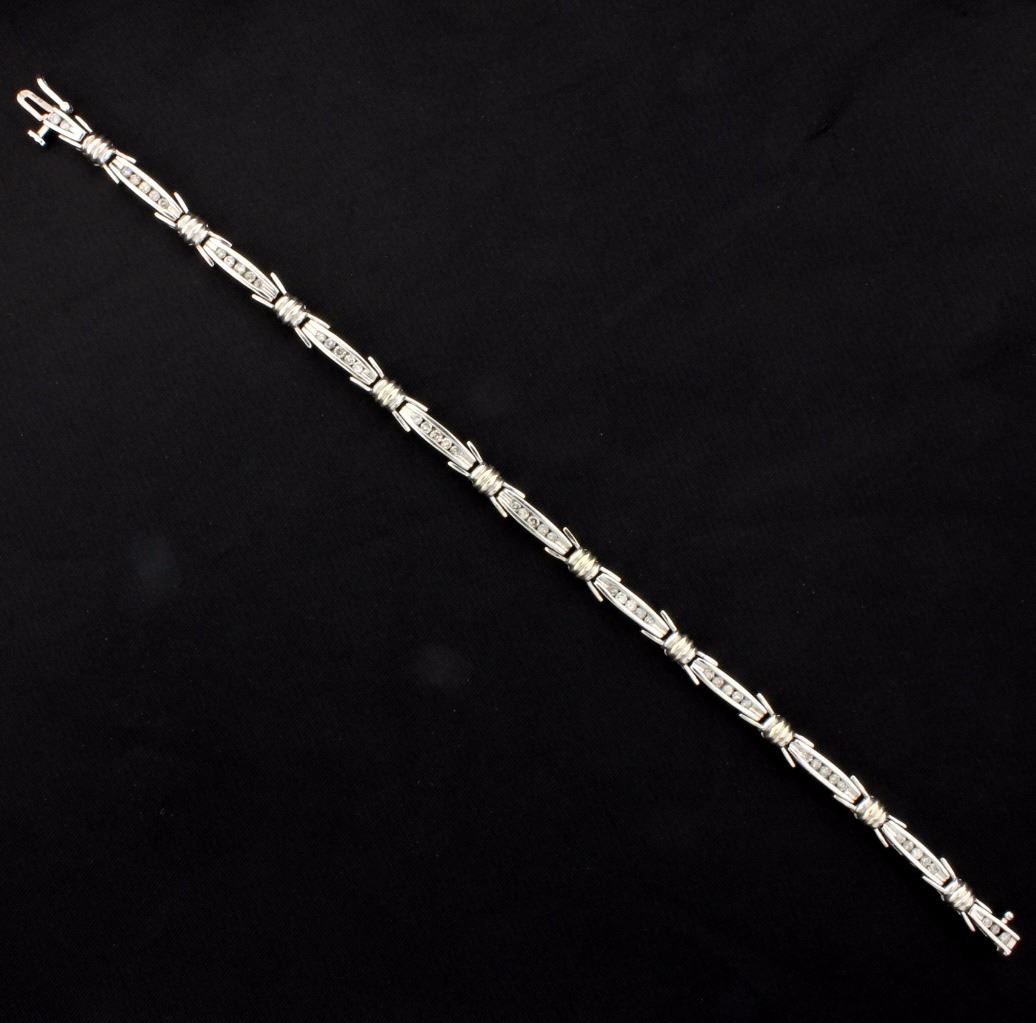 In 10K white gold, it is 7 1/2 inches long with a safety clasp. It contains 50 high quality .02 ct round diamonds. 9.8g