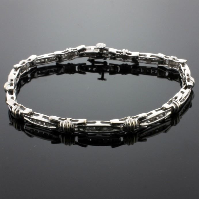 In 10K white gold, it is 7 1/2 inches long with a safety clasp. It contains 50 high quality .02 ct round diamonds. 9.8g