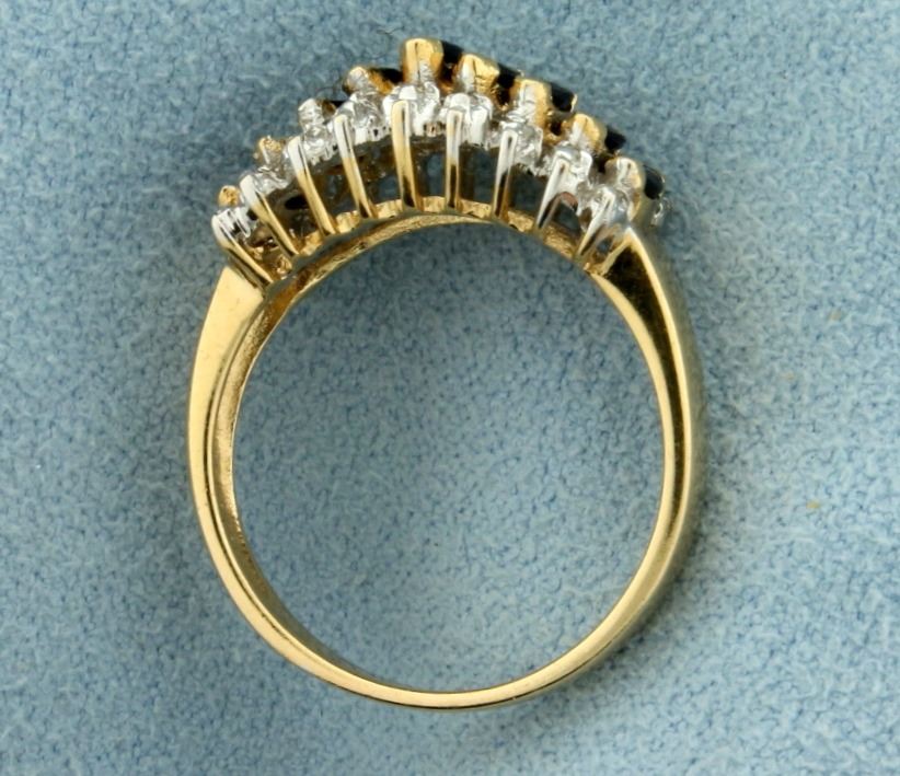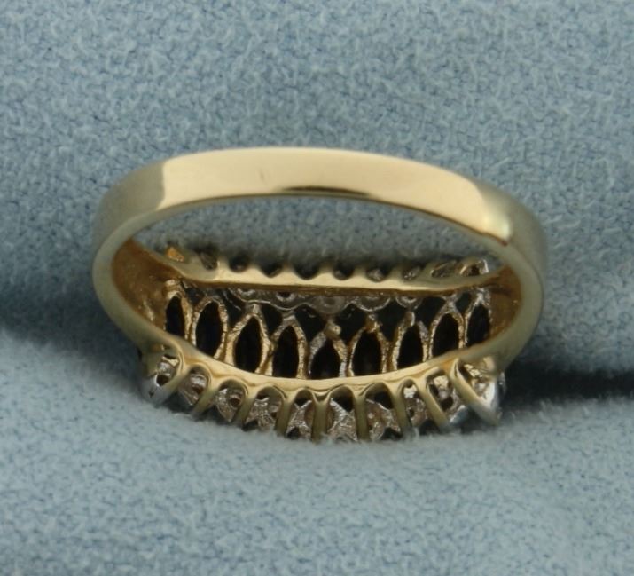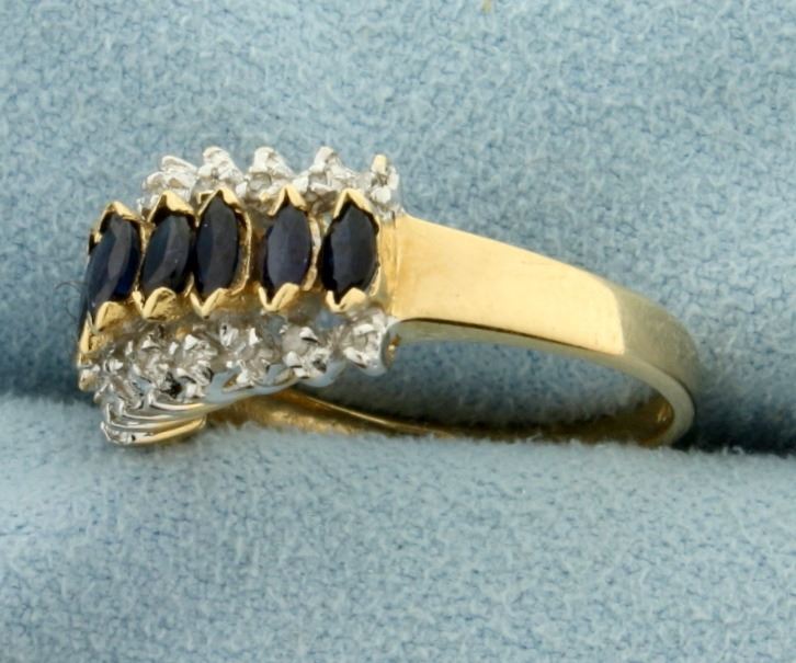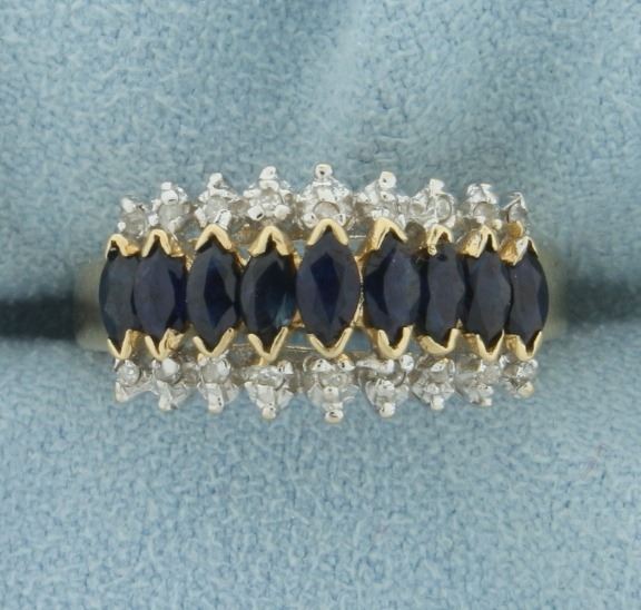 In 14K Yellow and White Gold. Contains nine natural high quality 4x2mm marquise cut Sapphire gemstones with deep blue color and excellent clarity. Also contains eighteen high quality 1/2pt Diamonds. Size 6 1/4. 3.2g