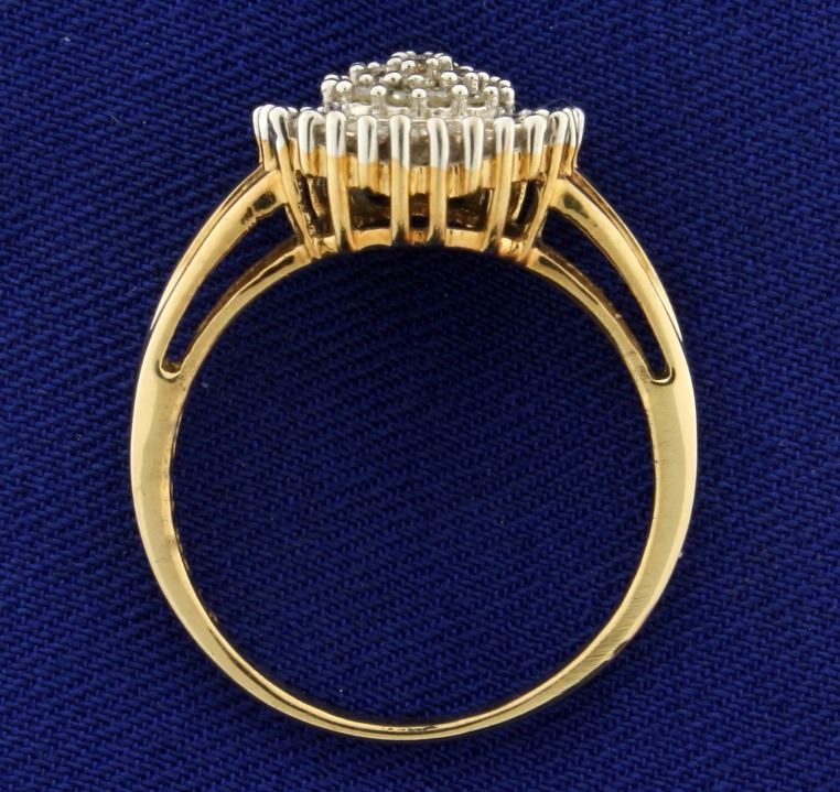 In 14k yellow gold. Contains 1/4 ct TW of high quality round brilliant diamonds and 3/4 ct TW of high quality baguette diamonds. Diamonds are I color/I clarity. Size 8. 3.0g.