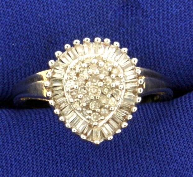 In 14k yellow gold. Contains 1/4 ct TW of high quality round brilliant diamonds and 3/4 ct TW of high quality baguette diamonds. Diamonds are I color/I clarity. Size 8. 3.0g.