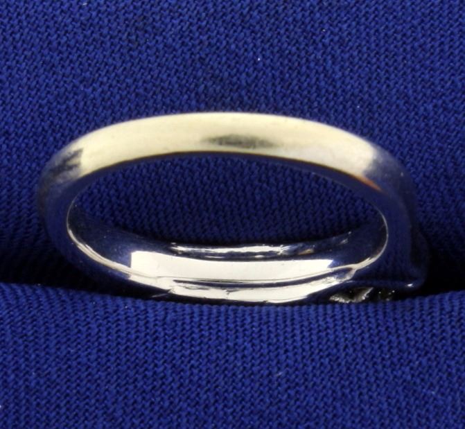 In 14k white gold. Containing three round high quality diamonds: Center is .3ct, side stones are .2cts each. Also contains six baguette .05ct high quality diamonds. Diamonds are SI clarity/I color, great cut with lots of sparkle. Size 7 1/4. 5.1g.