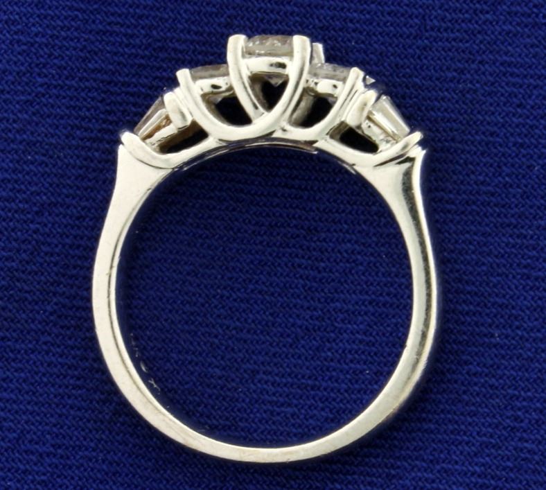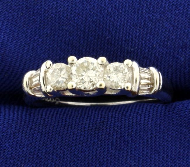 In 14k white gold. Containing three round high quality diamonds: Center is .3ct, side stones are .2cts each. Also contains six baguette .05ct high quality diamonds. Diamonds are SI clarity/I color, great cut with lots of sparkle. Size 7 1/4. 5.1g.