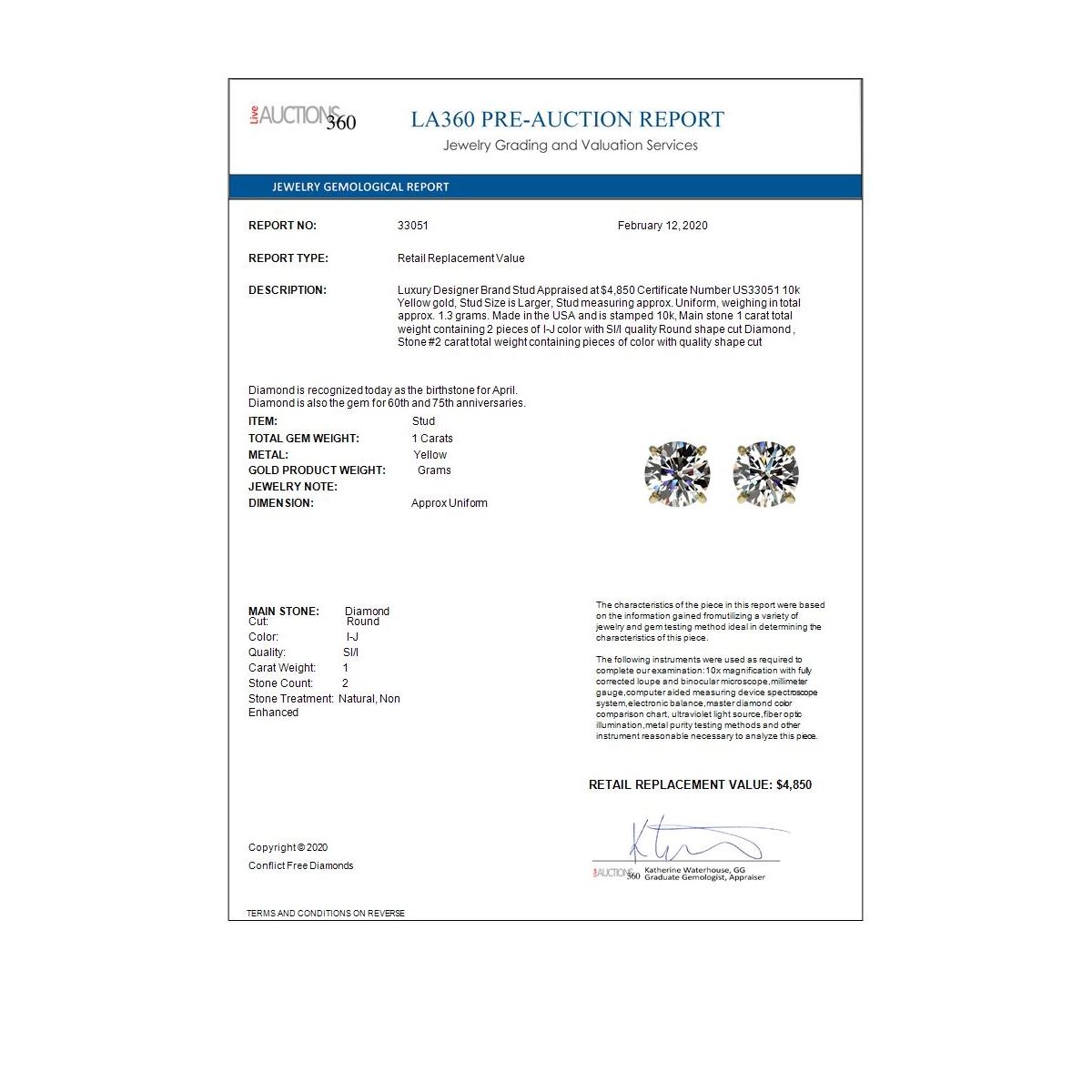 REF-72W3H - SKU: 33051 ---- 1 ctw Certified Quality Diamond Stud Earrings 10k Yellow Gold