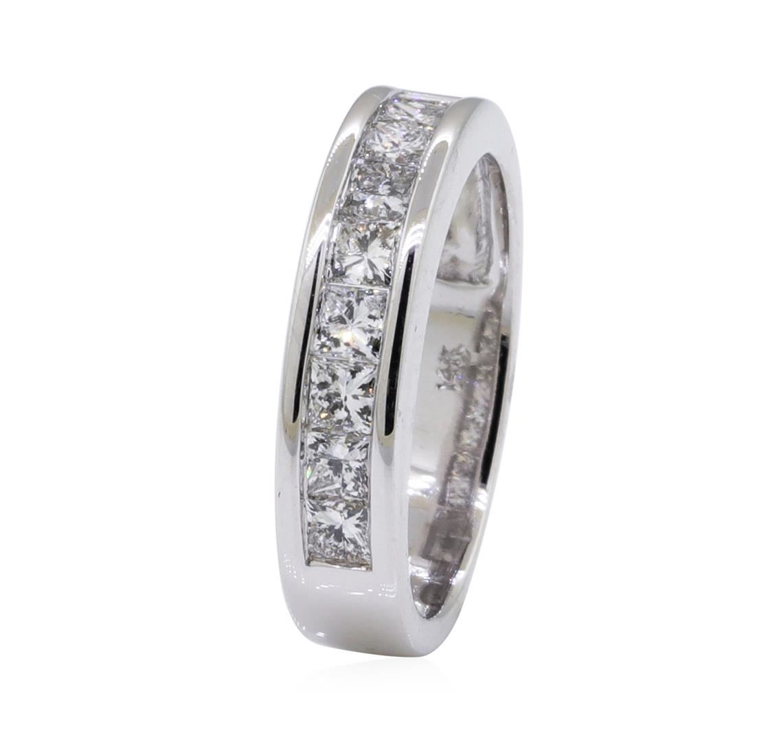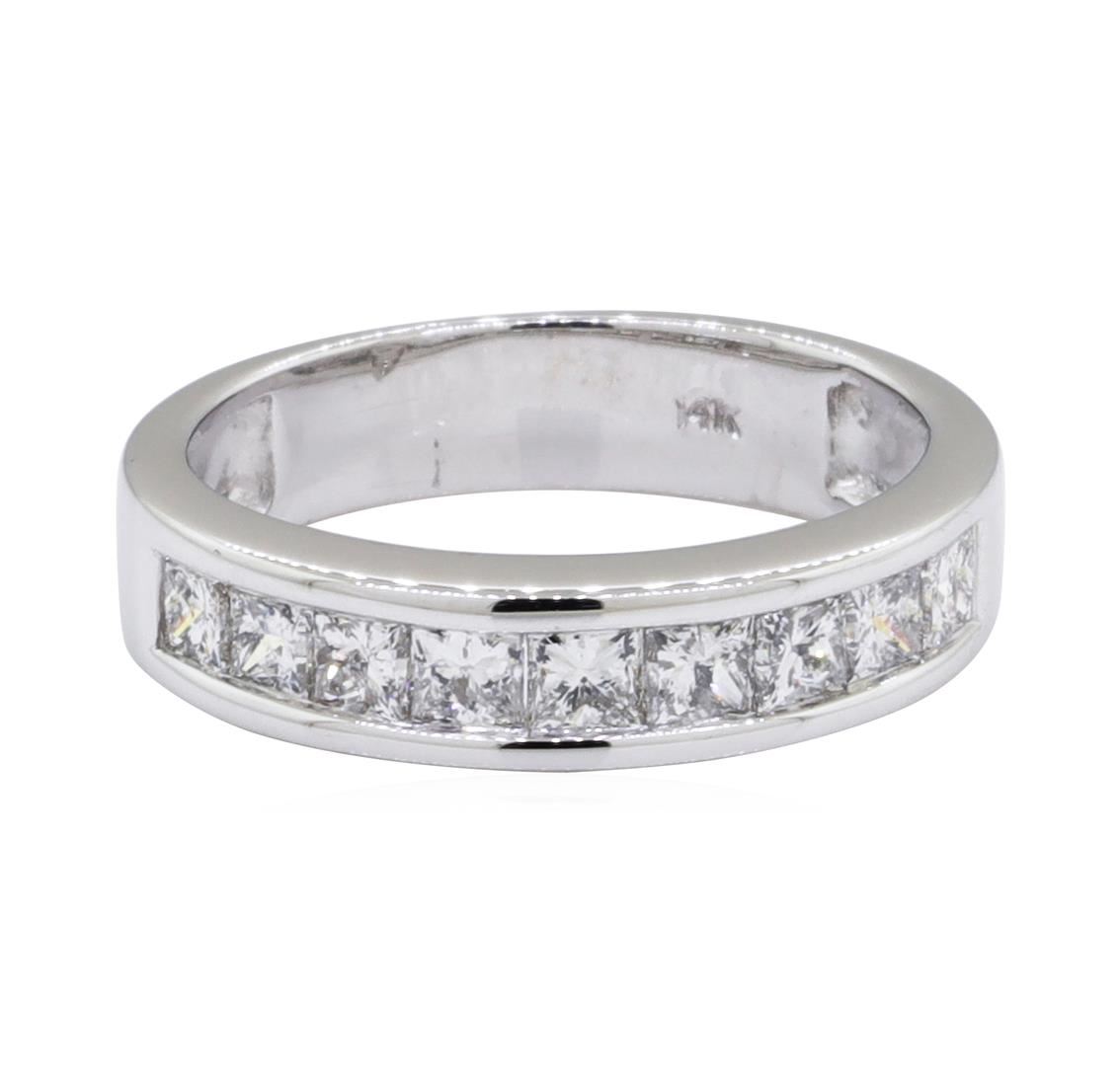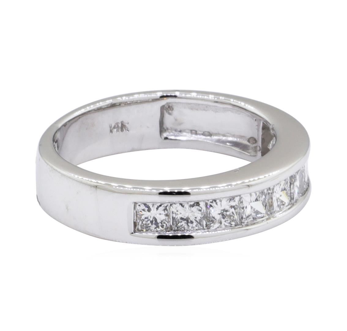 One electronically tested 14KT white gold lady's cast wedding band with a bright polish finish. This featured lady's ring has a shank measuring 4.50 millimeters in width. Identified with markings of '14K'. Condition is new, good workmanship. Containing: Nine channel set princess cut diamonds, measuring 2.60 x 2.50 x 1.88mm (depth est.) approximate total weight of 9 Stones = 1.00ct. Graded in the setting. Color H - I Clarity SI-1 to I-1 Cut Good. Total Weight of Diamonds 1.00ct.. Total Weight of Band 4.10gm GAS Appraised at $1990.00. GAS Appraised.