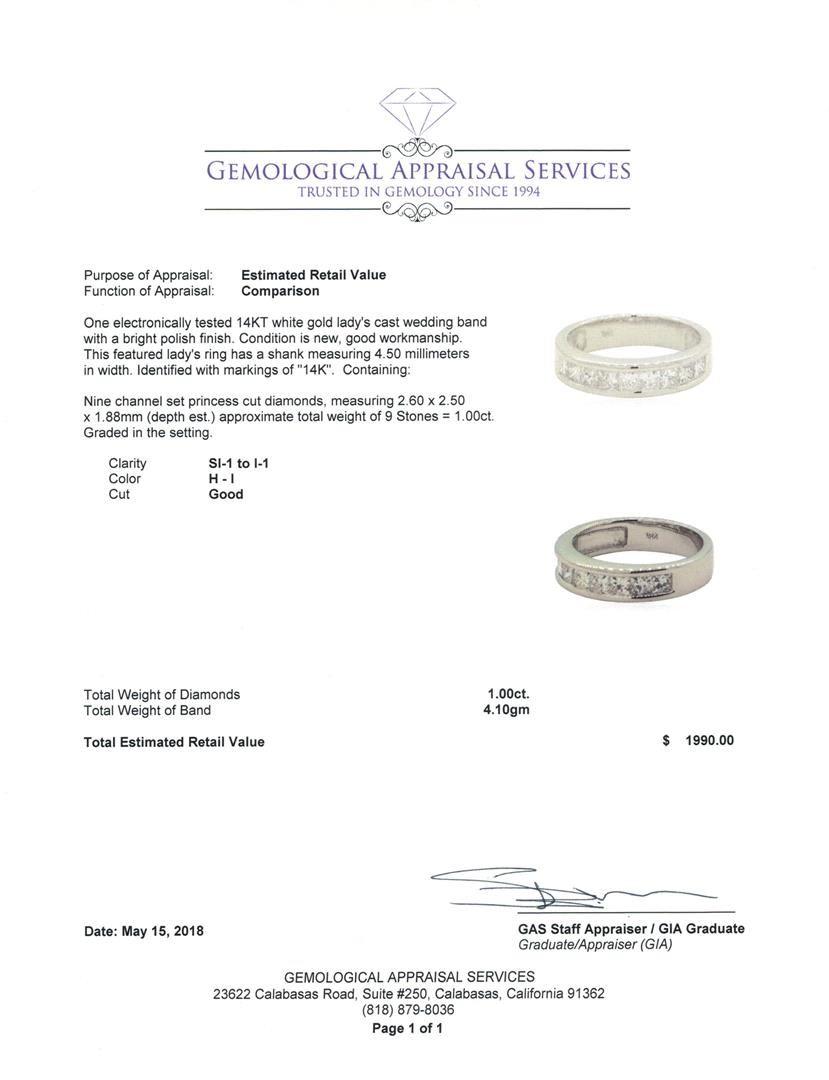 One electronically tested 14KT white gold lady's cast wedding band with a bright polish finish. This featured lady's ring has a shank measuring 4.50 millimeters in width. Identified with markings of '14K'. Condition is new, good workmanship. Containing: Nine channel set princess cut diamonds, measuring 2.60 x 2.50 x 1.88mm (depth est.) approximate total weight of 9 Stones = 1.00ct. Graded in the setting. Color H - I Clarity SI-1 to I-1 Cut Good. Total Weight of Diamonds 1.00ct.. Total Weight of Band 4.10gm GAS Appraised at $1990.00. GAS Appraised.