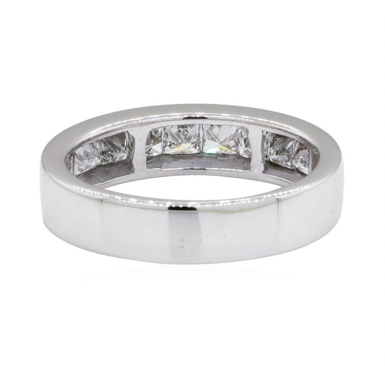 One electronically tested 14KT white gold lady's cast wedding band with a bright polish finish. This featured lady's ring has a shank measuring 4.50 millimeters in width. Identified with markings of '14K'. Condition is new, good workmanship. Containing: Nine channel set princess cut diamonds, measuring 2.60 x 2.50 x 1.88mm (depth est.) approximate total weight of 9 Stones = 1.00ct. Graded in the setting. Color H - I Clarity SI-1 to I-1 Cut Good. Total Weight of Diamonds 1.00ct.. Total Weight of Band 4.10gm GAS Appraised at $1990.00. GAS Appraised.