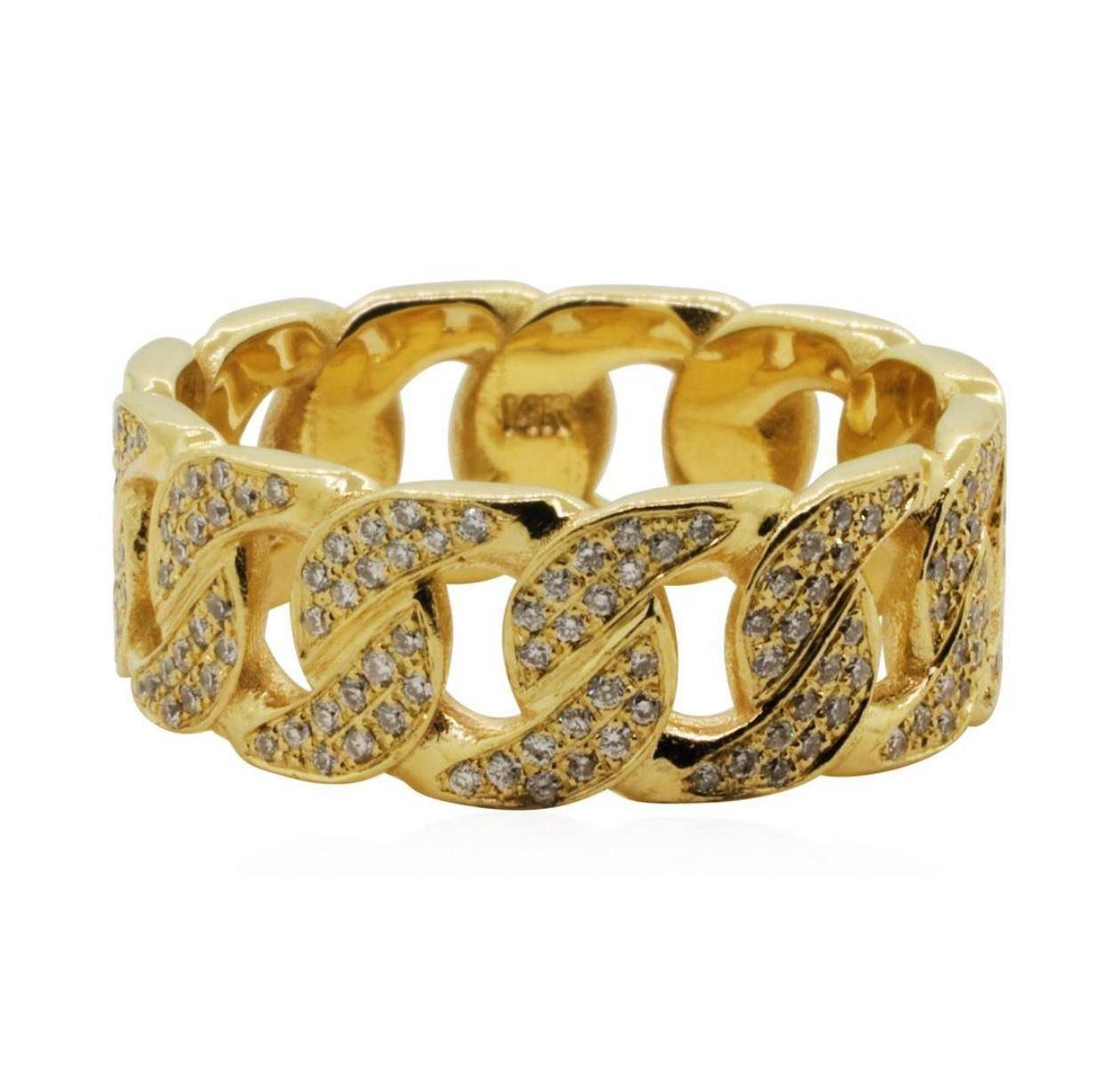 One electronically tested 14KT yellow gold lady's cast fashion curb link eternity band with a bright polish finish. This featured lady's ring has a shank measuring 7.86 millimeters in width. Identified with markings of '14K'. Condition is new, good workmanship. Containing: Two Hundred Forty prong set round brilliant cut diamonds, measuring 1.10 - 0.90 x 0.62mm (depth est.) approximate total weight of 240 Stones = 1.00ct. Graded in the setting. Color G - H Clarity VS-2 to SI-1 Cut Very Good. Total Weight of Diamonds 1.00ct.. Total Weight of Band 7.00gm GAS Appraised at $5260.00. GAS Appraised.