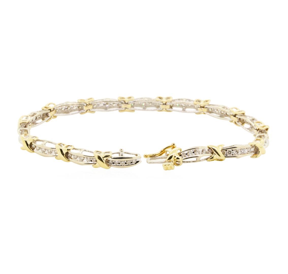One electronically tested 10KT white and yellow gold lady's combination cast & assembled fashion bracelet with a tongue clasp & foldover safety with a bright polish finish. The featured lady's bracelet measures seven inches in length. Identified with markings of '10K'. Condition is new, good workmanship. Containing: Seventy prong set round brilliant cut diamonds, measuring 1.70 - 1.40 x 0.96mm (depth est.) approximate total weight of 70 Stones = 1.00ct. Graded in the setting. Color H - J Clarity SI-1 to I-1 Cut Good. Total Weight of Diamonds 1.00ct.. Total Weight of Bracelet 11.00gm GAS Appraised at $3400.00. GAS Appraised.