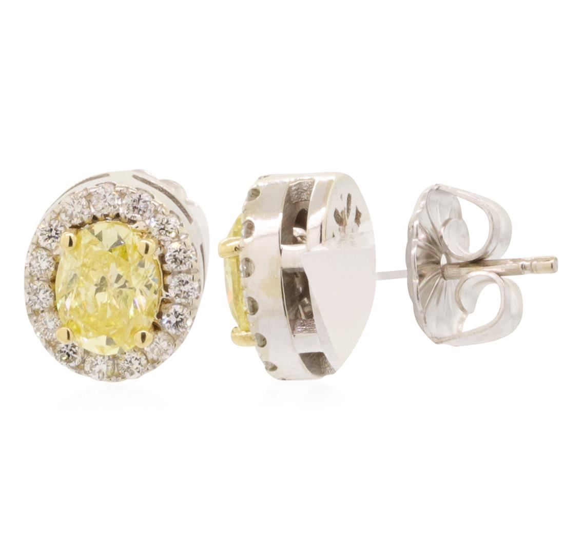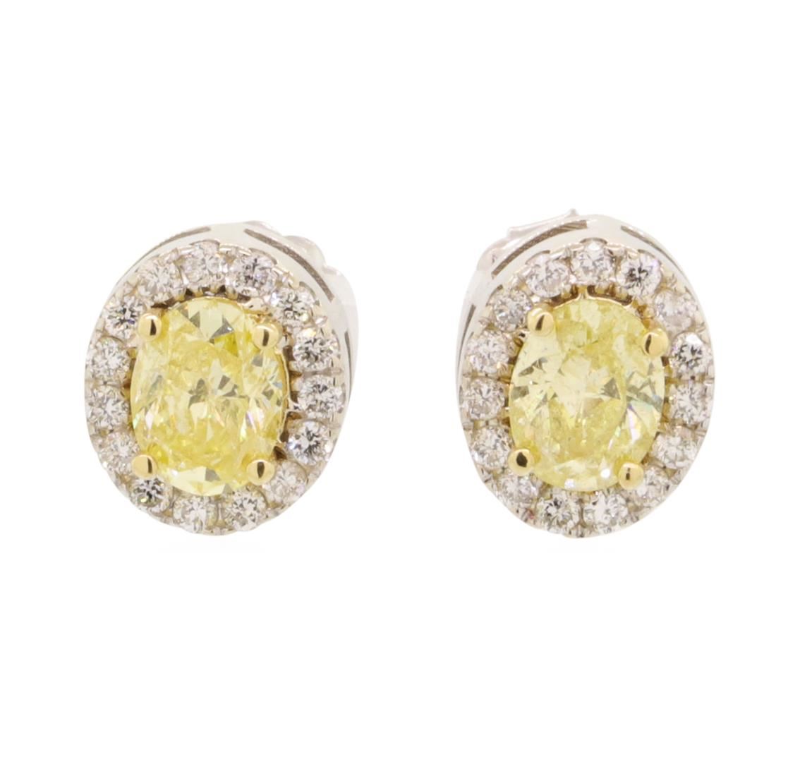 One pair electronically tested 14KT yellow and white gold lady's combination cast & assembled fashion earrings with friction posts with a oval halo with a bright polish finish. Identified with markings of '14K'. Condition is new, good workmanship. Containing: Two prong set oval shaped cut diamonds, measuring 6.02 x 4.53 x 2.85mm (depth est.) approximate total weight of 2 Stones = 1.00ct. Colored gemstones are presumed to have been subjected to commonly used enhancement processes. Graded in the setting. Color Fancy Yellow Clarity I-1 to I-2 Cut Good Thirty prong set round brilliant cut diamonds, measuring 1.50 - 1.45 x 0.92mm (depth est.) approximate total weight of 30 Stones = 0.40ct. Graded in the setting. Color H - I Clarity SI-1 to SI-2 Cut Very Good. Total Weight of Diamonds 1.40ct.. Total Weight of Earrings 3.60gm GAS Appraised at $5105.00. GAS Appraised.