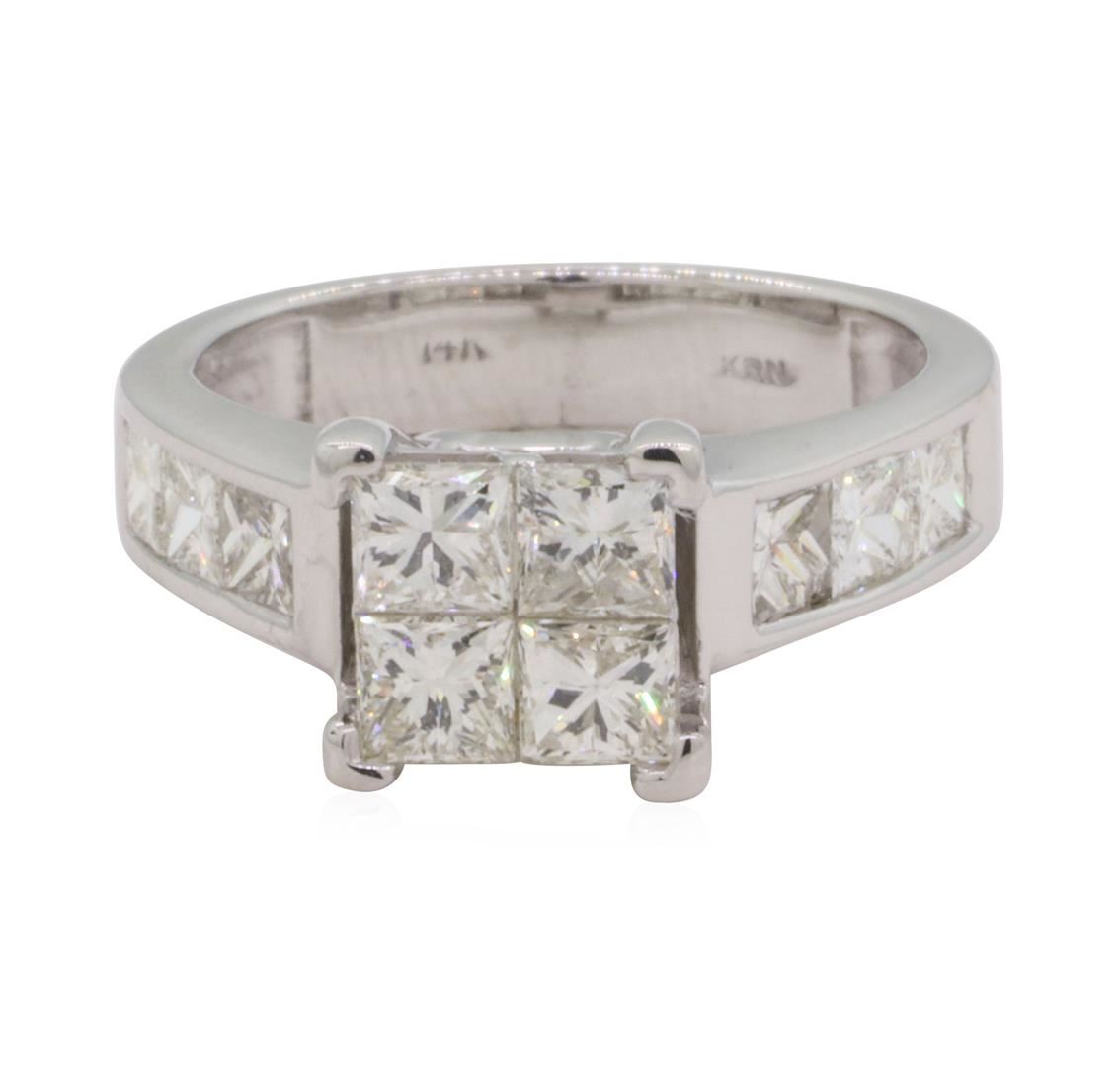One electronically tested 14KT white gold lady's combination cast & assembled wedding ring with a cathedral shank with a bright polish finish. This featured lady's ring has a shank measuring 4.00 millimeters in width. Identified with markings of '14K'. Condition is new, good workmanship. Containing: Four invisible set princess cut diamonds, measuring 3.40 x 3.35 x 2.51mm (depth est.) approximate total weight of 4 Stones = 1.00ct. Graded in the setting. Color I - J Clarity SI-1 to SI-2 Cut Very Good Six channel set princess cut diamonds, measuring 3.00 x 2.95 x 2.21mm (depth est.) approximate total weight of 6 Stones = 1.00ct. Graded in the setting. Color I - J Clarity SI-1 to SI-2 Cut Very Good. Total Weight of Diamonds 2.00ct.. Total Weight of Ring 5.60gm GAS Appraised at $5265.00. GAS Appraised.