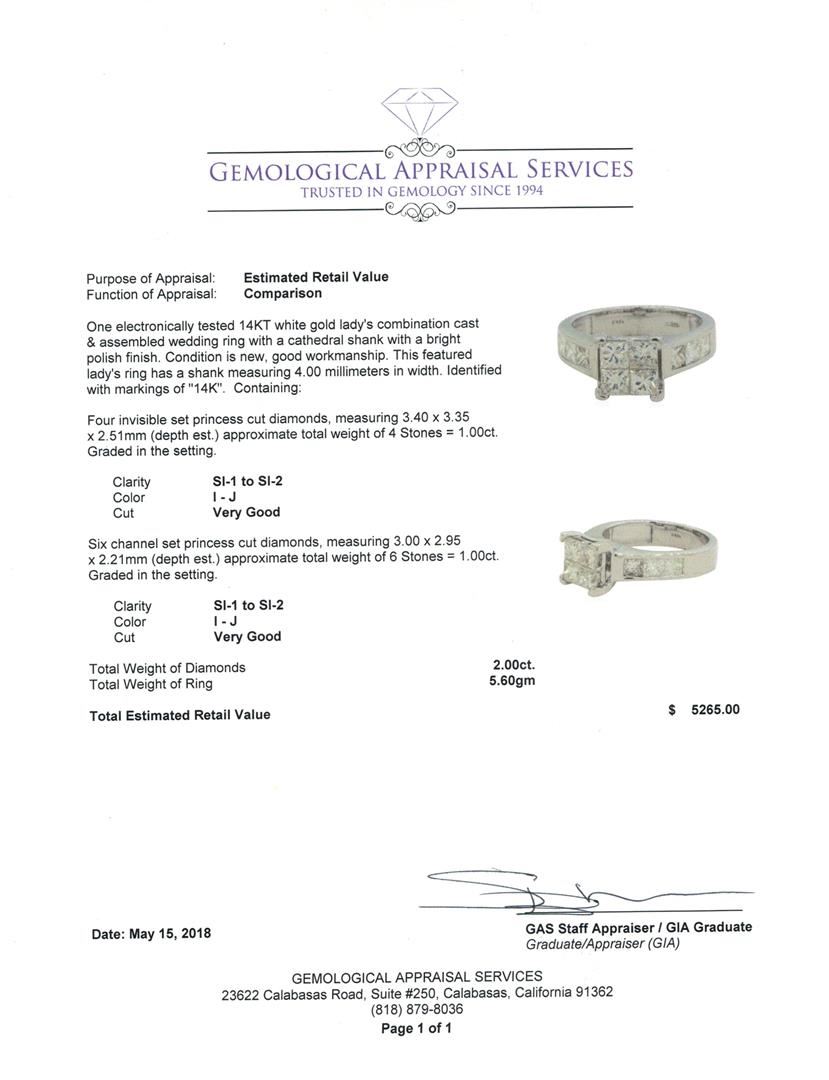 One electronically tested 14KT white gold lady's combination cast & assembled wedding ring with a cathedral shank with a bright polish finish. This featured lady's ring has a shank measuring 4.00 millimeters in width. Identified with markings of '14K'. Condition is new, good workmanship. Containing: Four invisible set princess cut diamonds, measuring 3.40 x 3.35 x 2.51mm (depth est.) approximate total weight of 4 Stones = 1.00ct. Graded in the setting. Color I - J Clarity SI-1 to SI-2 Cut Very Good Six channel set princess cut diamonds, measuring 3.00 x 2.95 x 2.21mm (depth est.) approximate total weight of 6 Stones = 1.00ct. Graded in the setting. Color I - J Clarity SI-1 to SI-2 Cut Very Good. Total Weight of Diamonds 2.00ct.. Total Weight of Ring 5.60gm GAS Appraised at $5265.00. GAS Appraised.