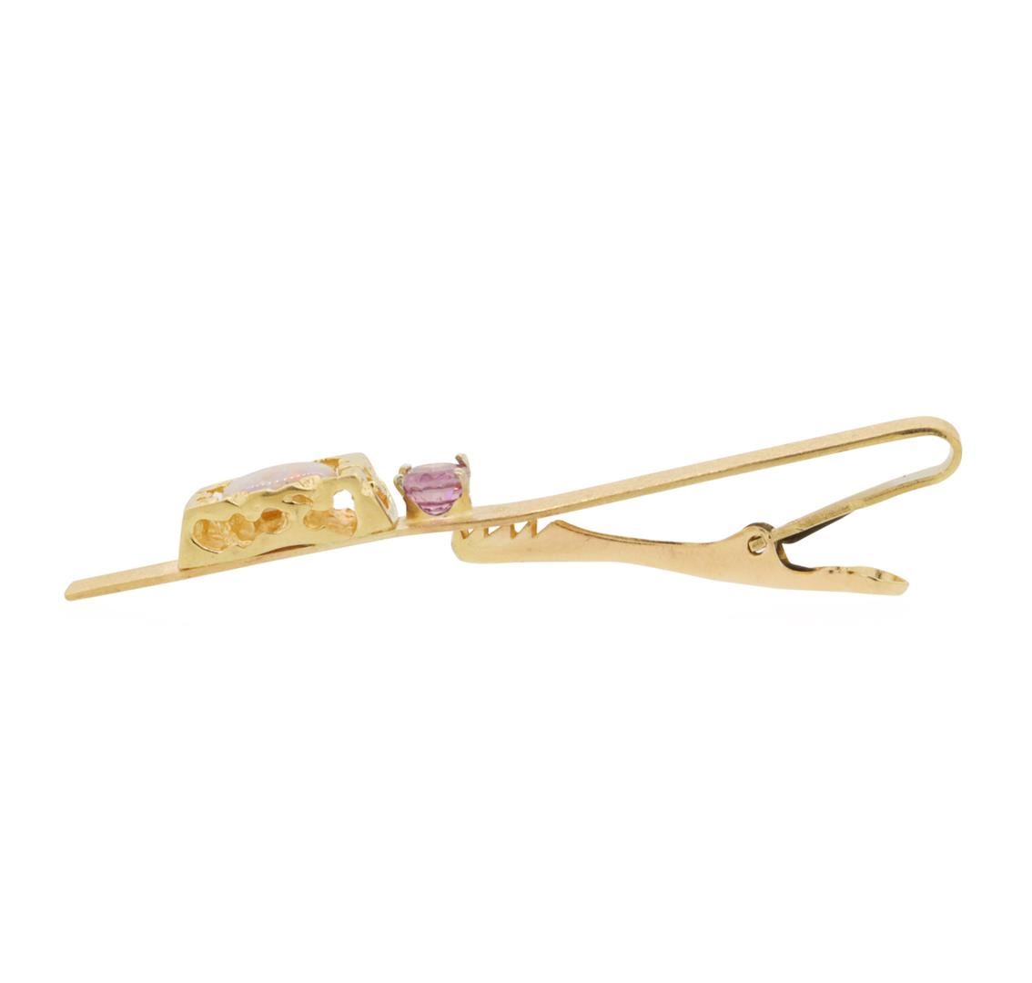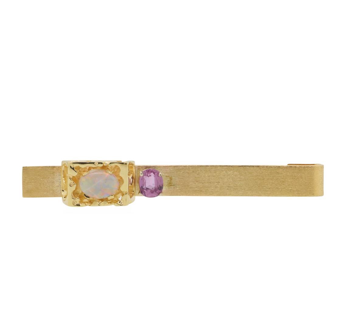 One tie clip featuring: 14KT yellow gold weighing 8.40 grams containing one opal weighing 1.00ct and one pink sapphire weighing 0.95ct.