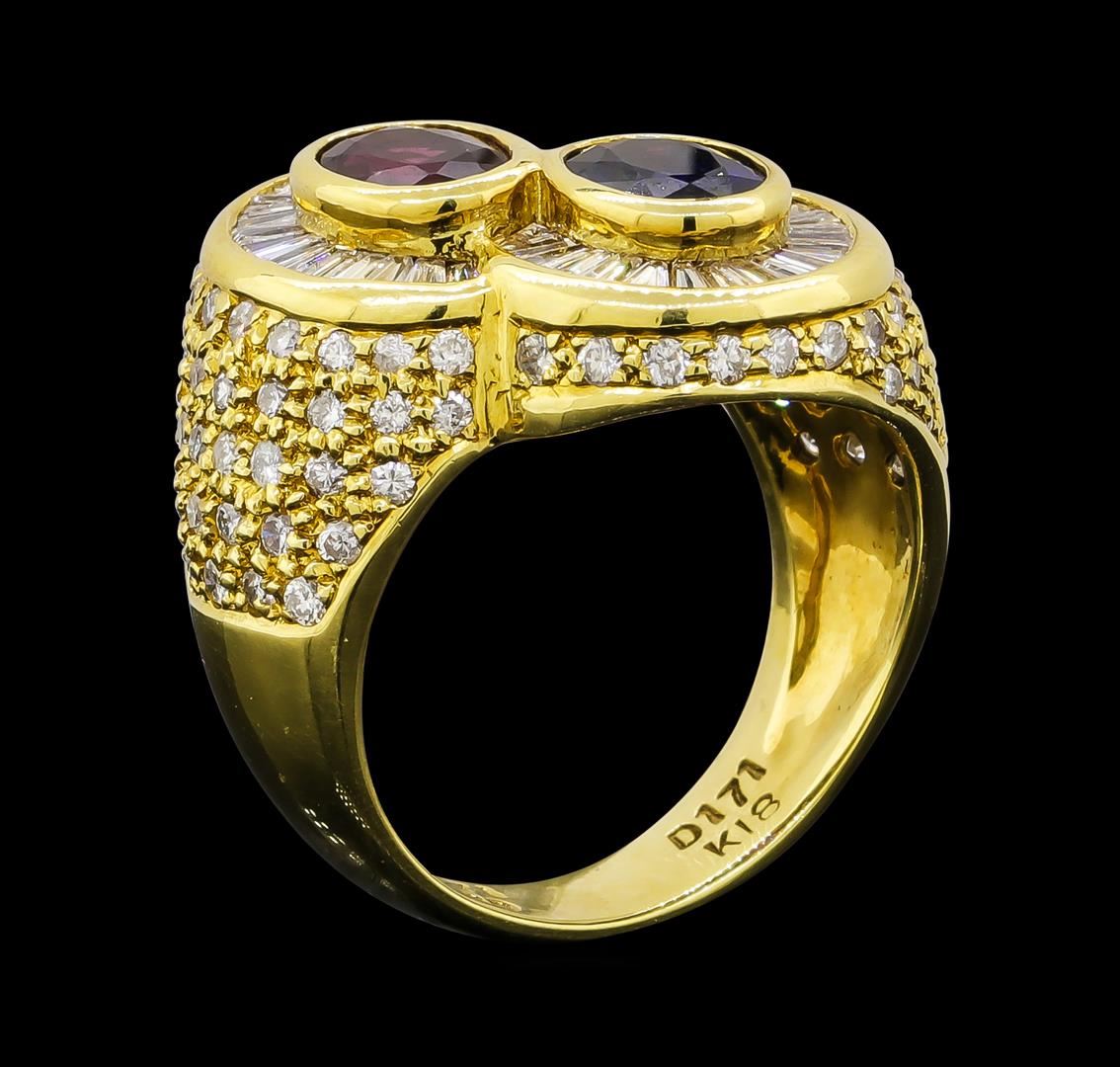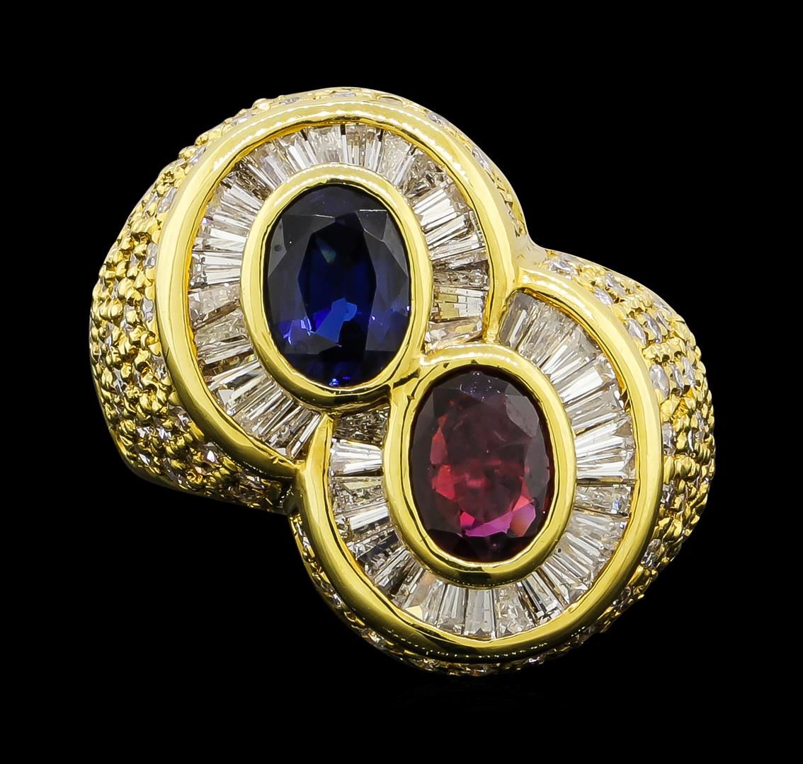 One ring featuring: 18KT Yellow Gold containing Sapphire with a total weight of 1ct, Ruby with a total weight of 0.71ct, and Diamonds with a total weight of 1.71ct. Total Weight of Ring: 10.9 grams.