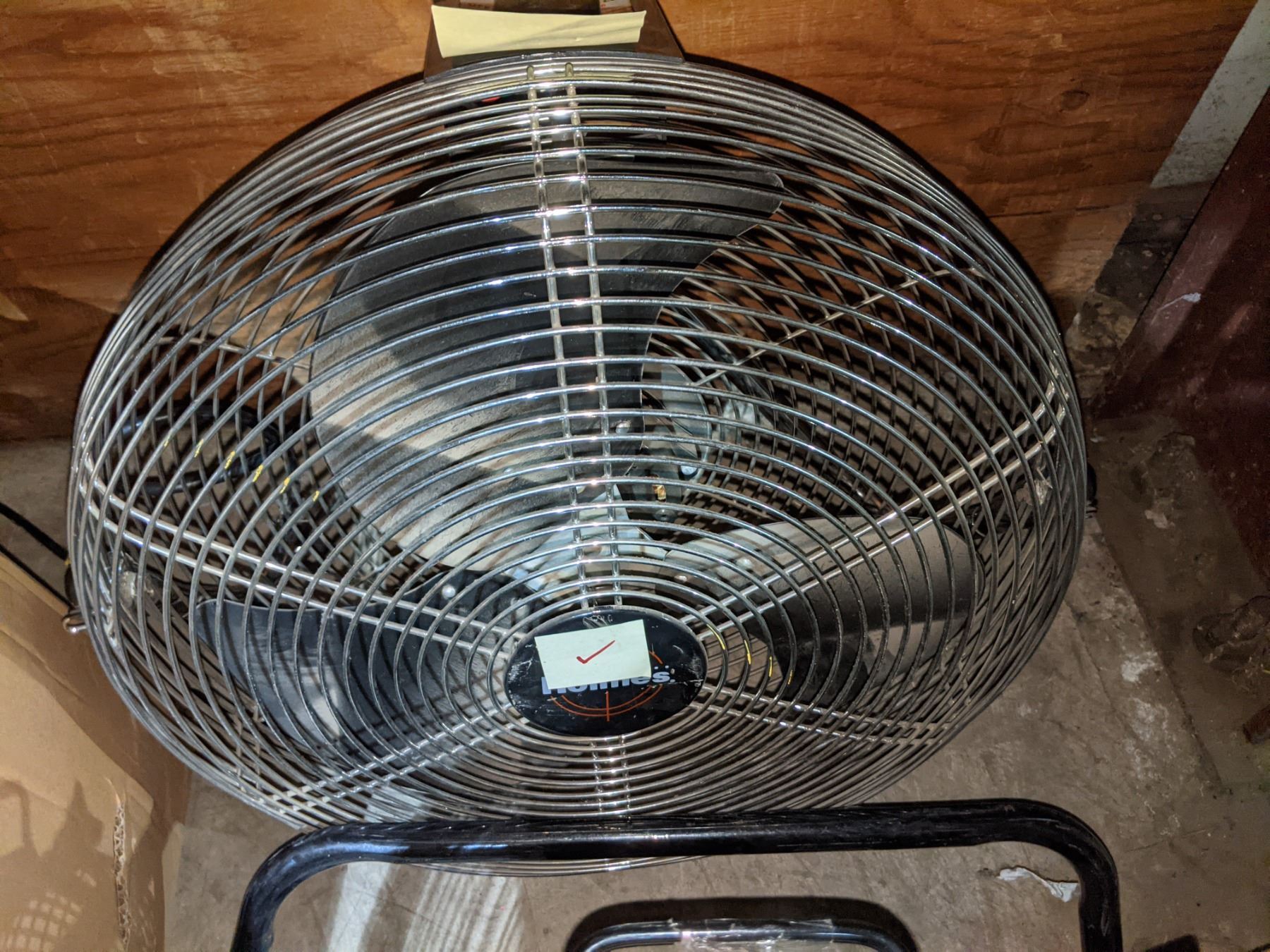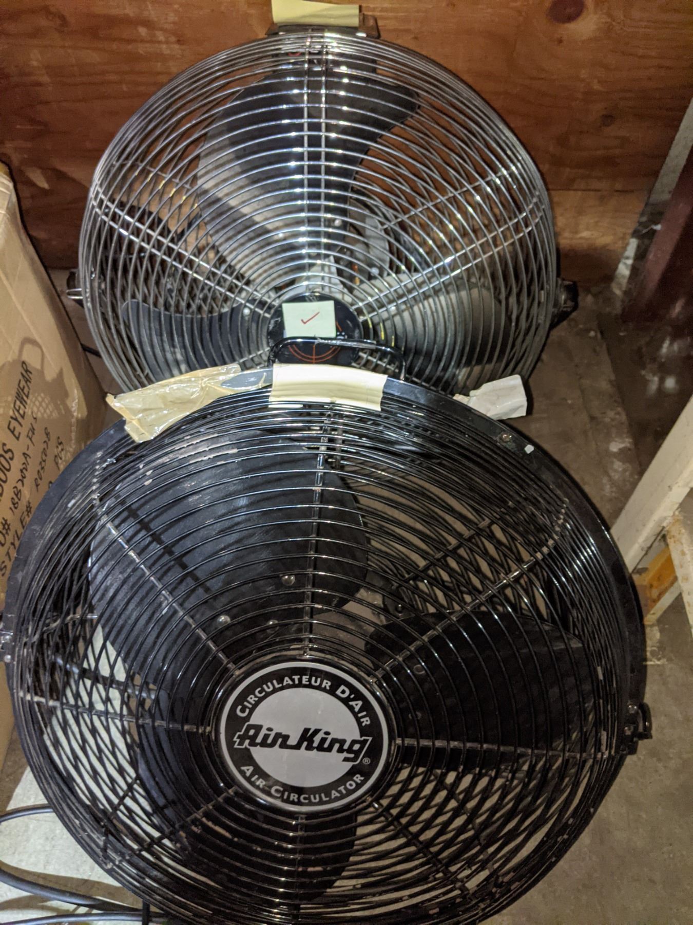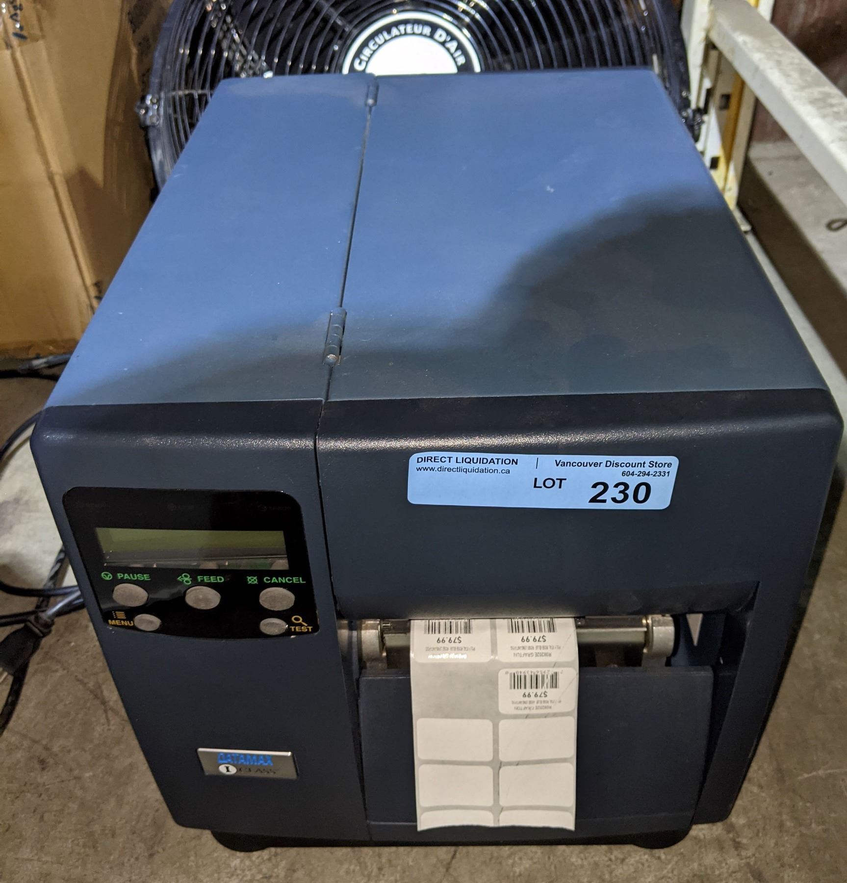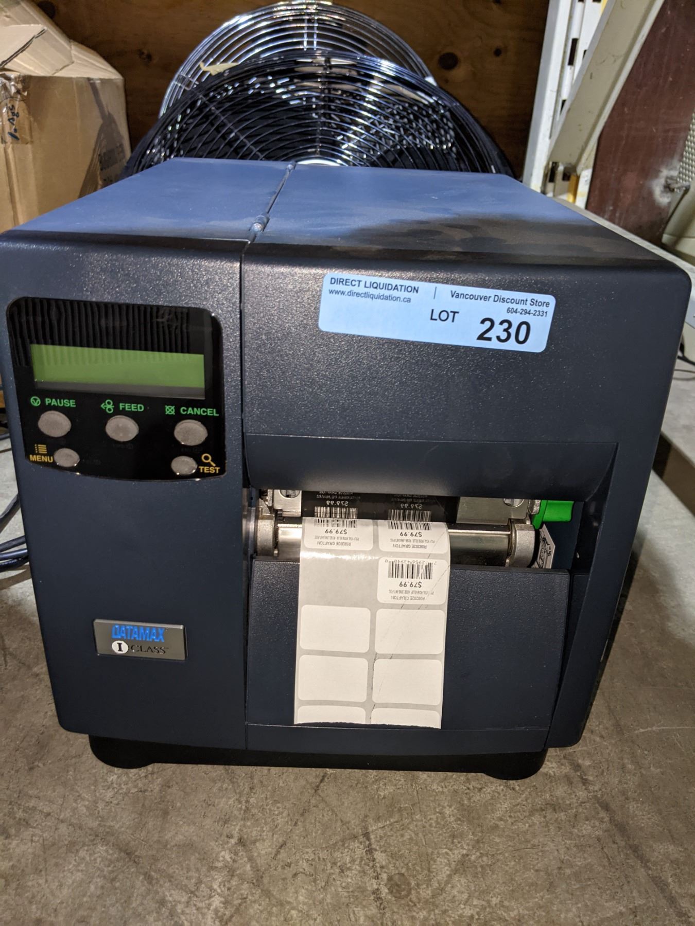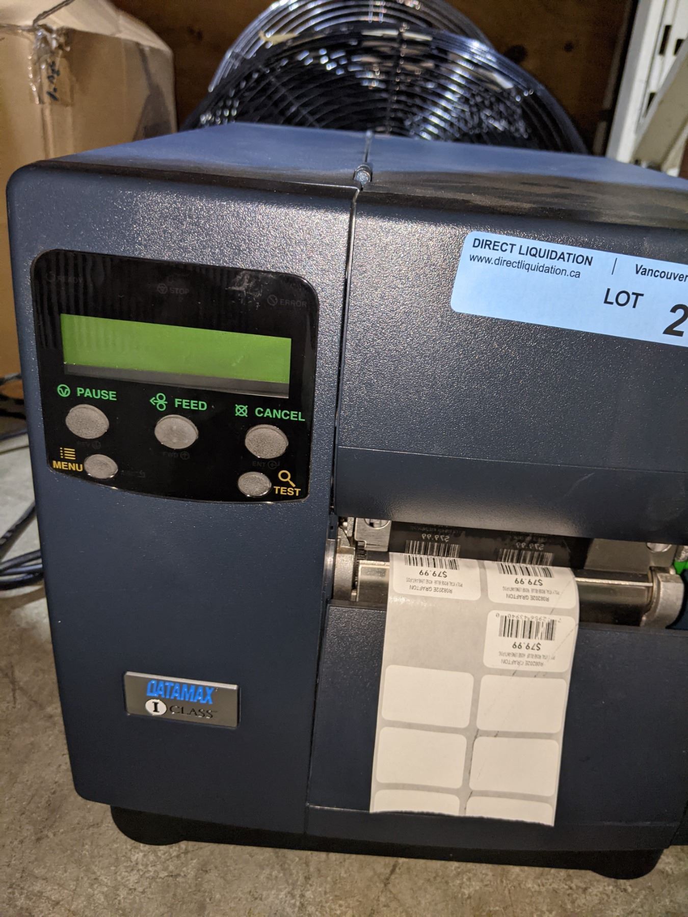1 data max I class label printer, 1 sato CL408 label printer, 2 industrial fans and a box full of p