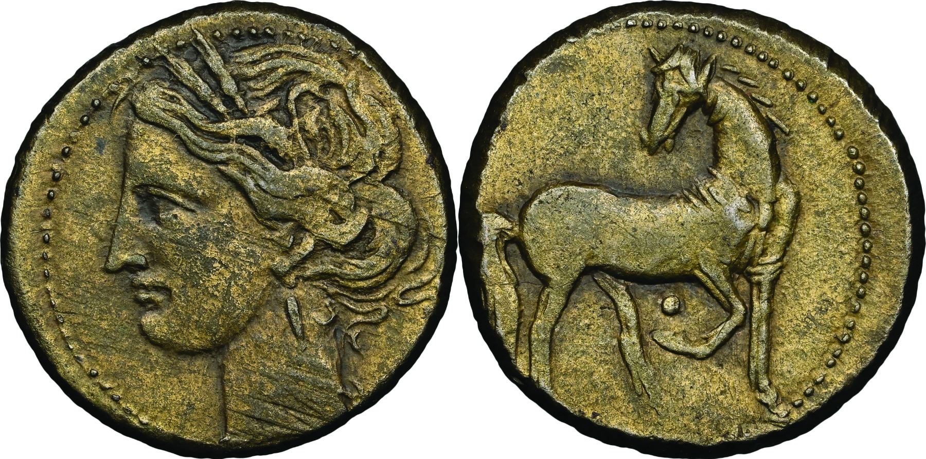 Avers : Tête de Tanit (Koré-Persephone) à gauche, portant une couronne de blé, une barre et une boucle d'oreille pendante, ainsi qu'un collier