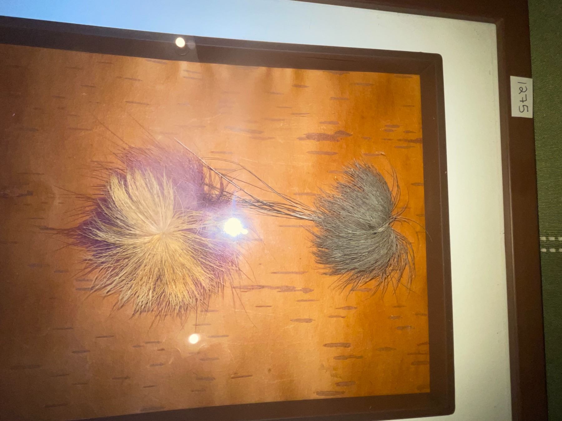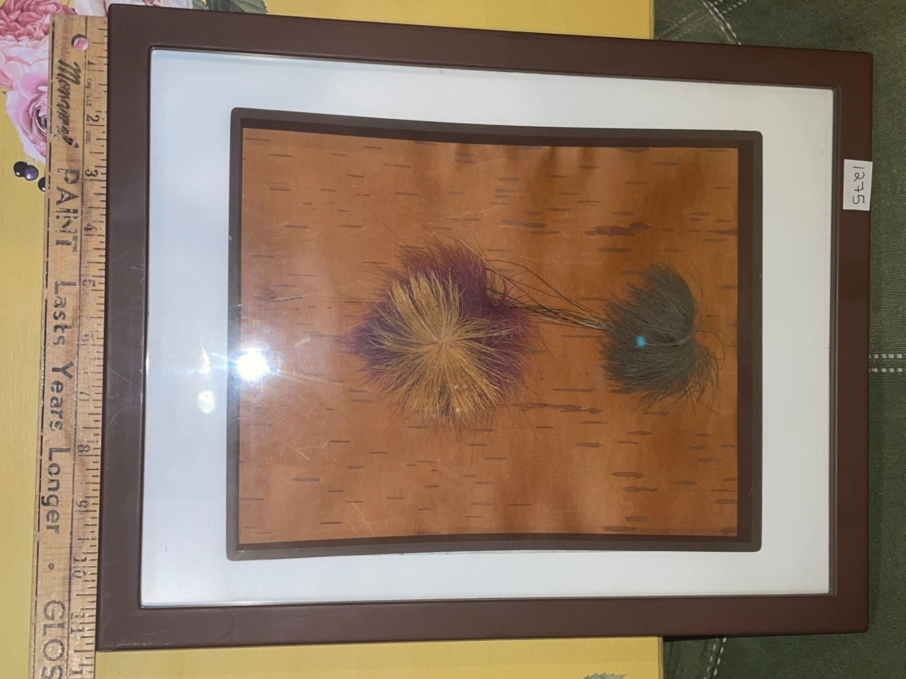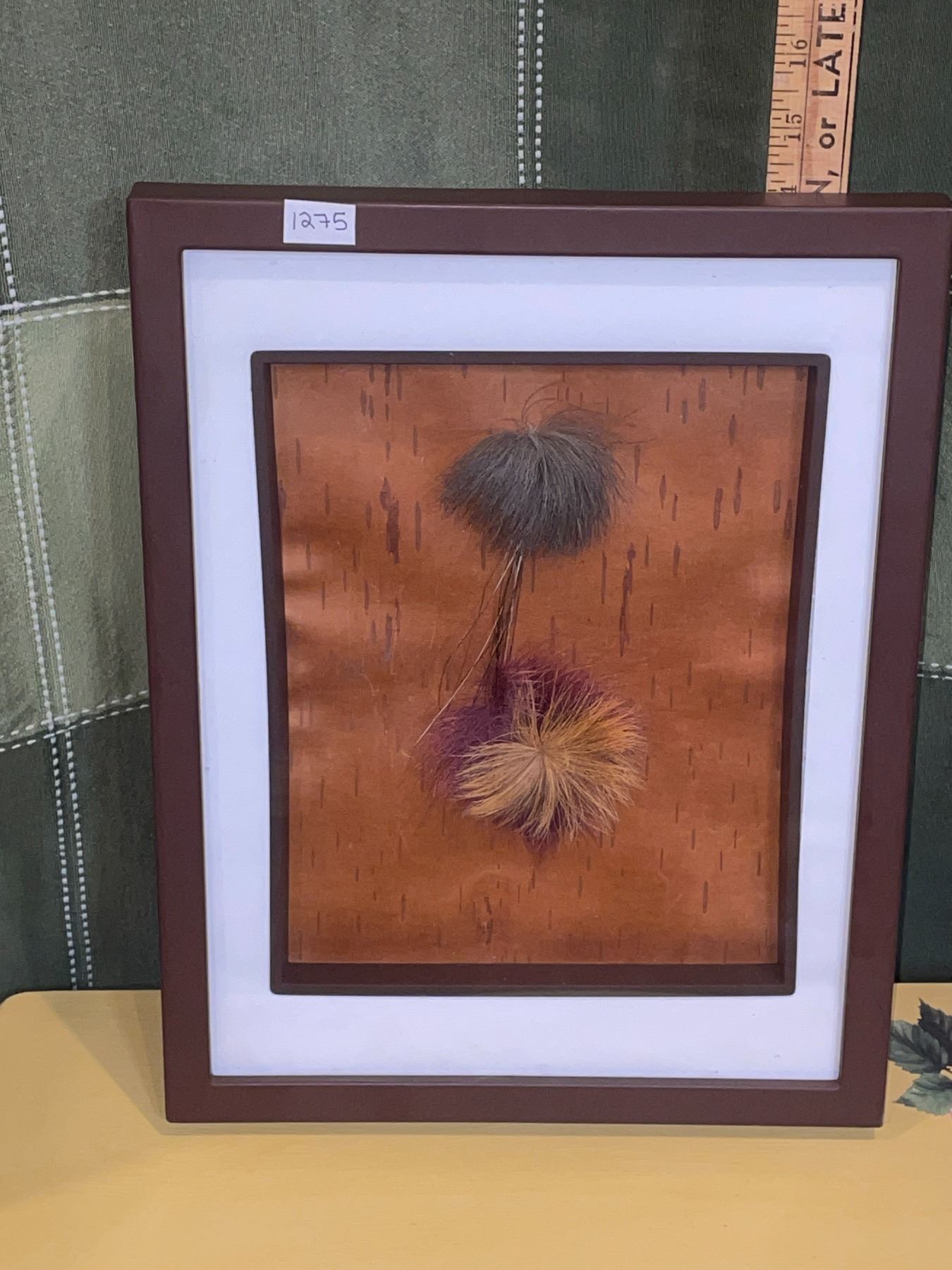 1 framed piece of moose hair tufting artwork, on birch bark.