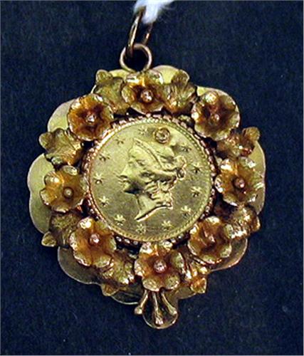 $1 gold liberty coin in an ornate bezel. 5.5gr coin has been repaired