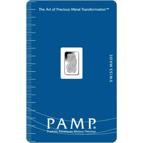 1 gram Platinum Bar PAMP Suisse Lady Fortuna .9995 Fine (In Assay PAMP Platinum Lady Fortuna bars are one of the most popular bullion on the market today because of its affordable size and the high quality. This 1 gram bar from an original Multigram +25 and housed in a mini PAMP Suisse Assay card, which verifies barês weight and purity. The PAMP Suisse (Produit Artistiques Metaux Precieux) is the worldês leading independent Precious Metals refiner and one of the most trusted mints worldwide today. The front side of the bar features an artistic rendition of –Lady Fortuna,” the Roman goddess of fate and fortune, commonly known as –Lady Luck”. This image depicts her as a blindfolded deity holding a cornucopia filled with coins. The back side of the bar is emblazoned with the PAMP Suisse logo at the top. It also displays all barês vital statistics including weight, purity, and a unique serial number. The –Essayeur Fonduer” insignia, which is featured underneath the text, serves as an engraved assay to verify this information.