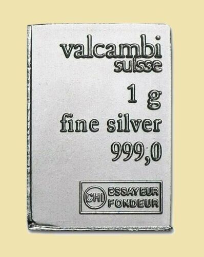 Contains a total of 1 gram of .999 fine Silver. Obverse: Each individual bar bears its purity and weight (1 gram) along with the Valcambi hallmark. Reverse: Each bar lists its .999 fine purity below the square Valcambi logo.