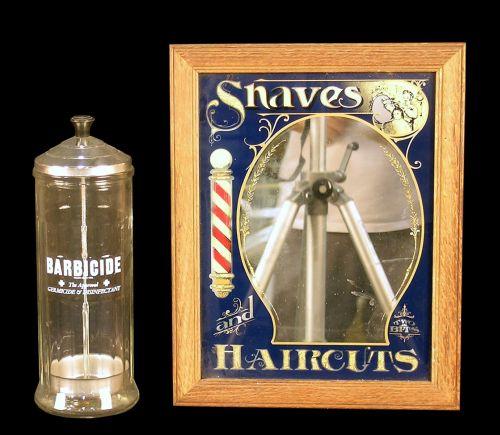 1 lot, 2 pieces.. B/Shop comb cannister & original art of the late Dean Hensley of "Shave & a Haircut" mirrored Pictures