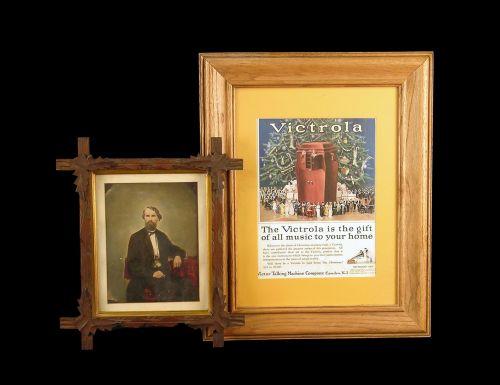 1 lot, 2 pieces Color enhanced photo & Victrola ad photo is from 1880's and has a wooden leafed frame