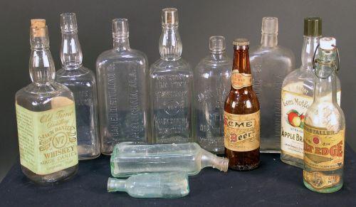 1 lot of 11old bottles (1900-1945) including Acme, Jack Daniels., etc Ruhstallers Gilt Edge Beer, and 2 tonic bottles