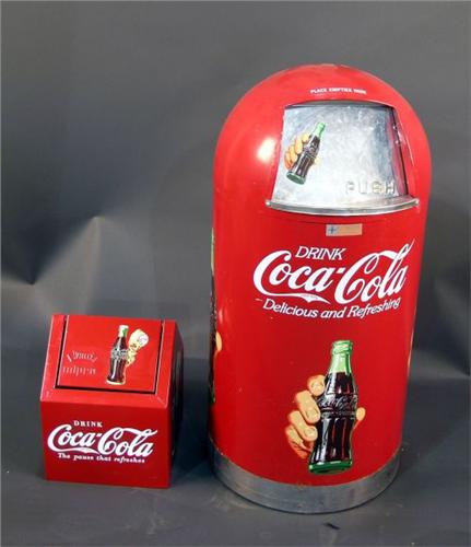 1 lot of 2 Coca-Cola trash cans 1 small & 1 large and a box of misc coke decals