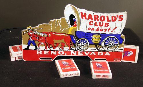 1 lot of 2 "Harolds Club" collectors items License plate frame and 5 decks of N.O.S. playing cards still sealed