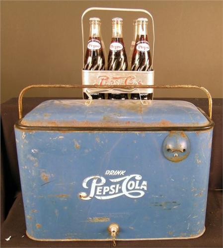 1 lot of 2 "Pepsi-Cola" items an airline style, picnic cooler and a 6-pak carrier full of bottles
