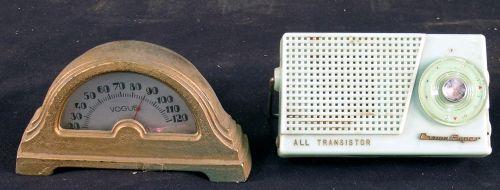 1 lot of 2 items.50's transister radio and an Art Deco thermometer