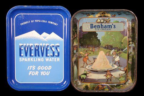 1 lot of 2 tin serving trays: "Benham's" Ice Cream w/ brownies 10 x 13" "Everess" sparkling water, "Pepsi-Cola" Co. 10 x 14 "