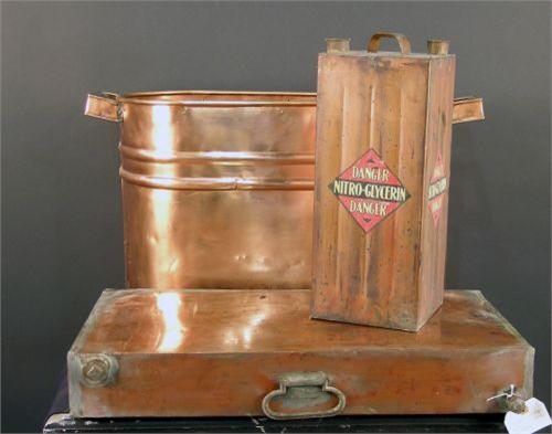 1 lot of 3 copper items copper boiler, copper fuel tank and a copper nitro- glycerine container