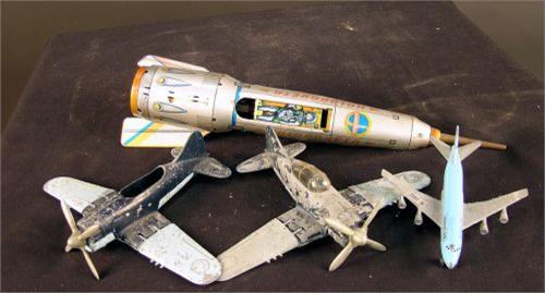 1 lot of 3 "Hubley" toy airplanes & a rocket