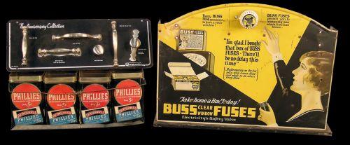 1 lot of 3 ad pieces... Buss electric fuses, Phillies 8-pak cigar box and an Amerock hardware display with handles and knobs