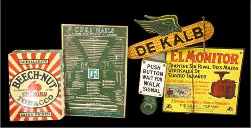 1 lot of 4 early signs and a "walk" traffic button DeKalb, CF&I nail display, Beech-Nut, El Monitor