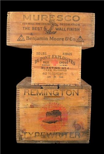 1 lot of 3 wooden adv boxes Remington typewriter box, Muresco paints and a Dupont box that held explosives (blasting caps)